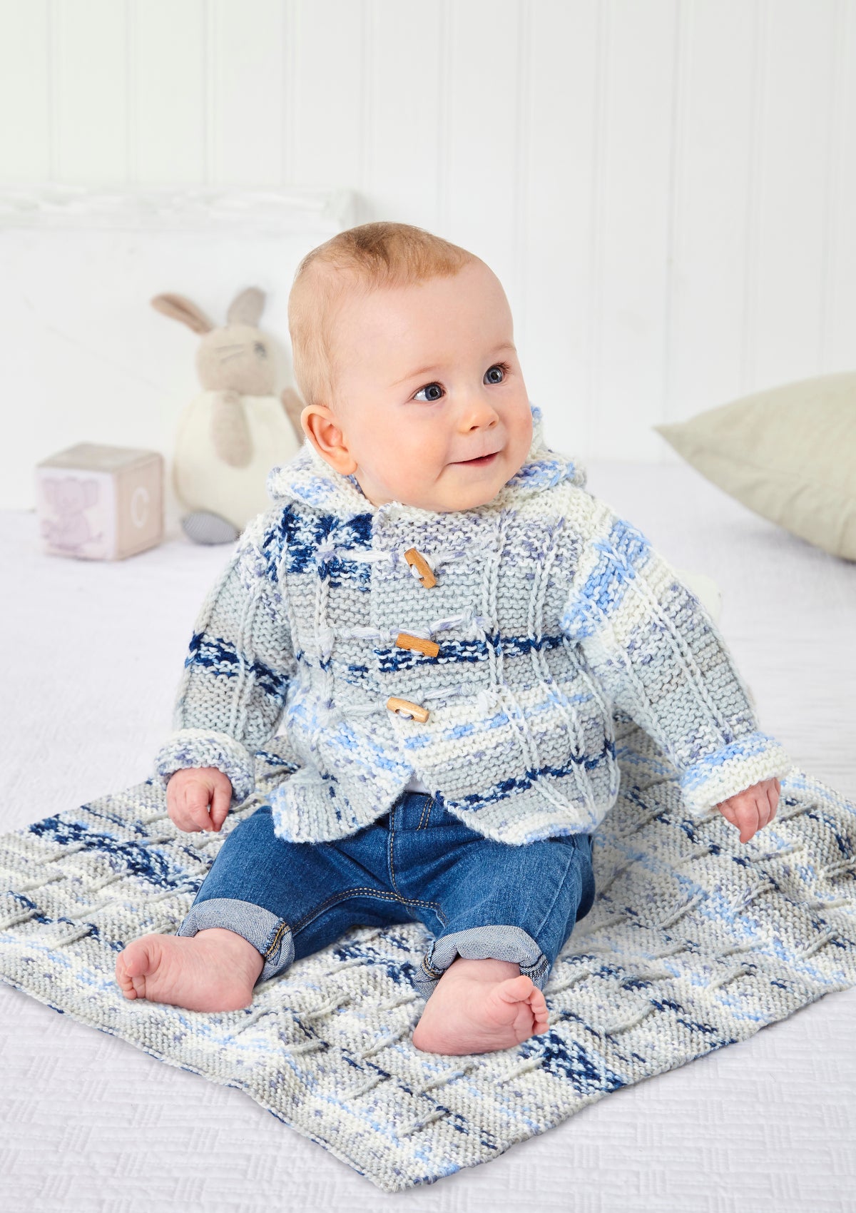 This baby aran knitting pattern leaflet 6045 by King Cole will instruct you on how to create a jacket, hat, socks and blanket.