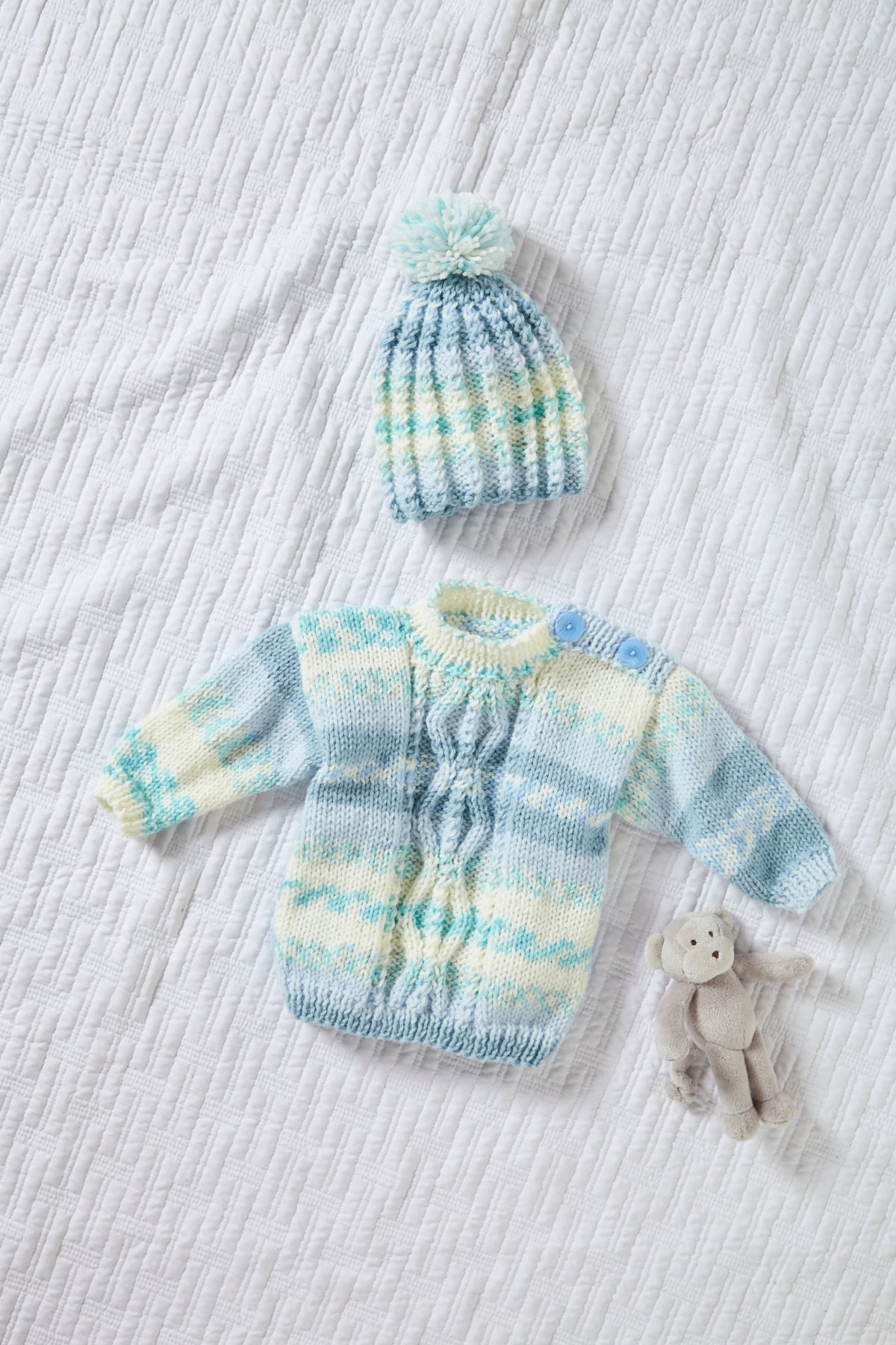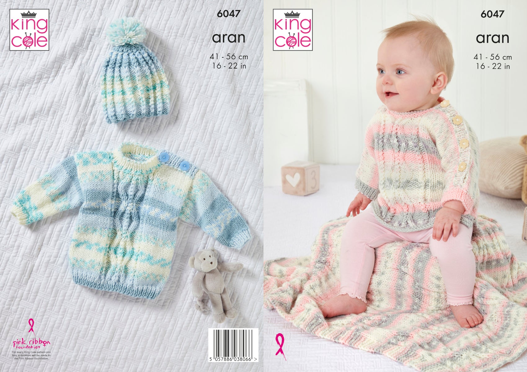 This baby aran knitting pattern leaflet 6047 by King Cole will instruct you on how to create a sweater, top, hat and blanket, with cable detailing.