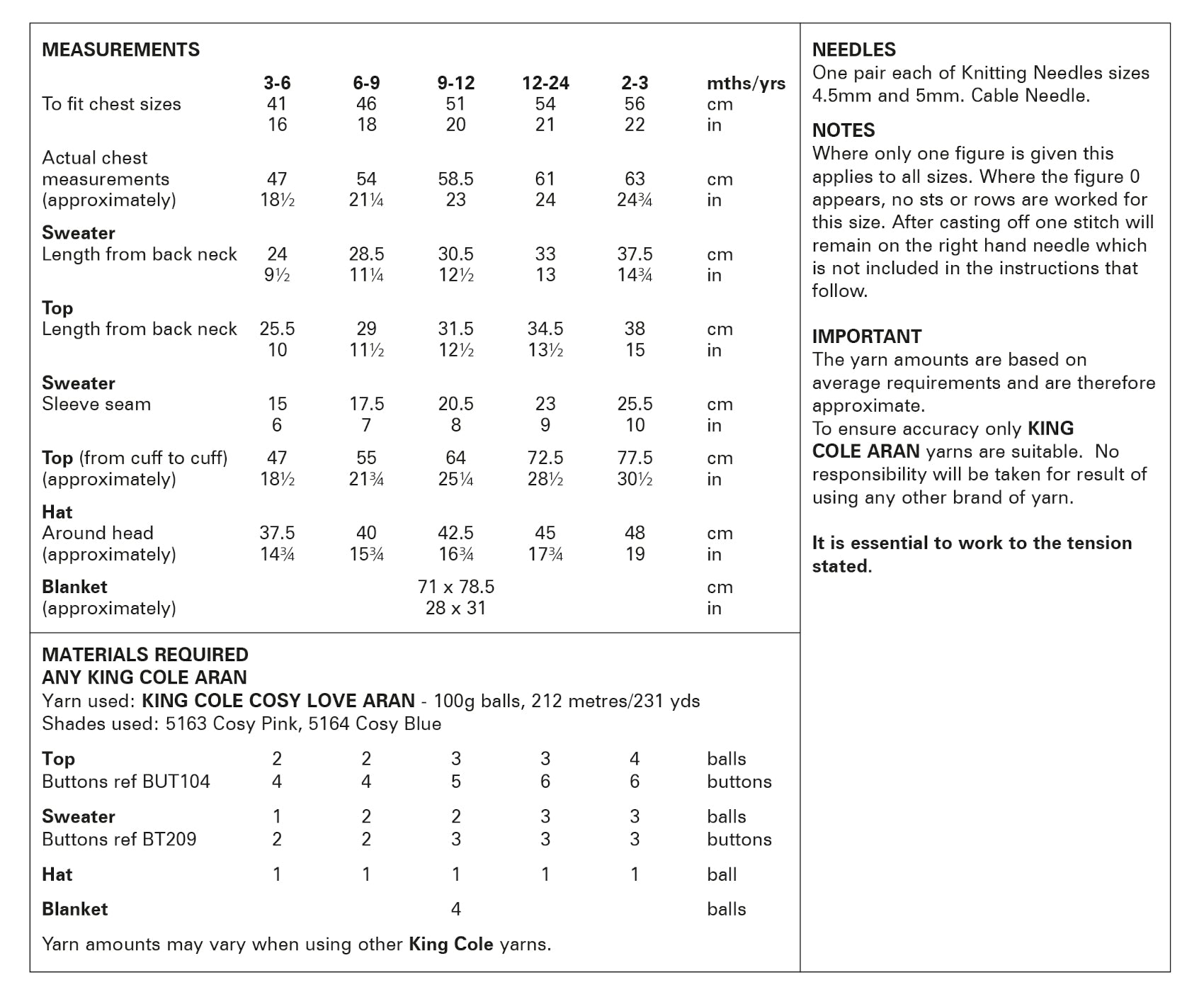 This King Cole knitting pattern is suitable for use with most aran yarns, however tensions may vary and we recommend you knit a tension square before knitting the whole garment.