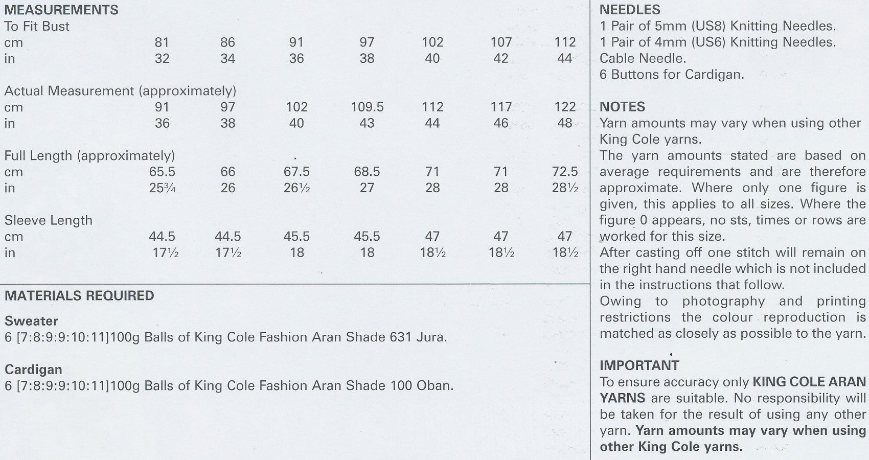 This King Cole knitting pattern is suitable for use with most aran knitting yarns however, tensions may vary and we recommend you knit a tension square before knitting the whole garment.