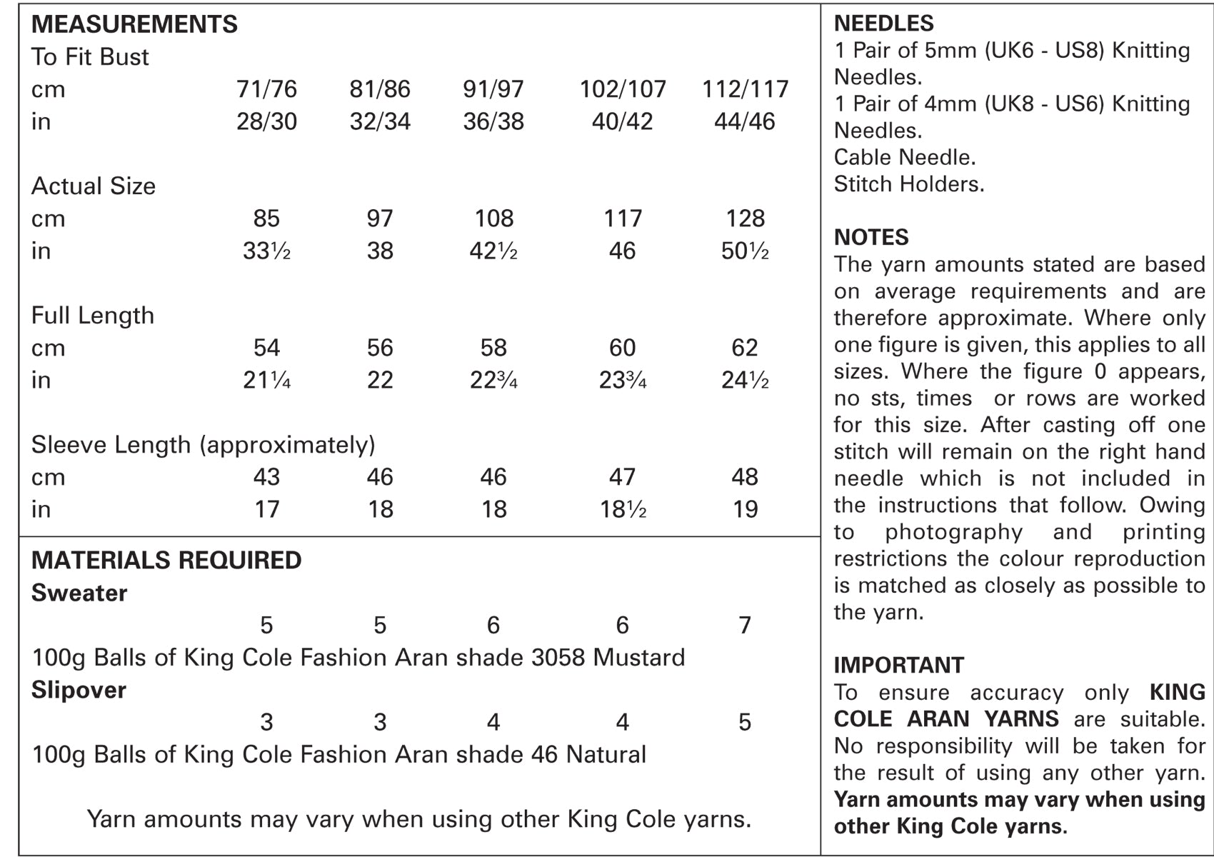 - Details: This is a King Cole aran knitting pattern that instructs you on how to knit a ladies slipover and sweater with cabled detail, using Fashion Aran yarn.
