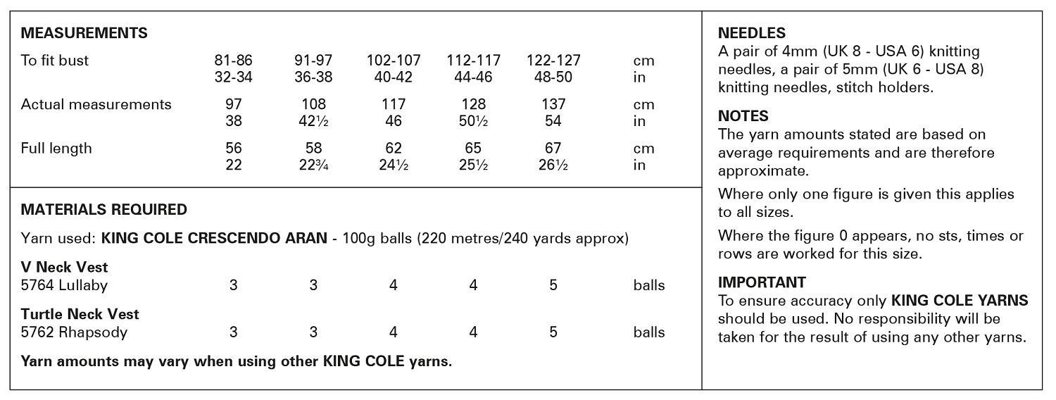 This King Cole knitting pattern is suitable for use with most aran yarns, however tensions may vary and we recommend you knit a tension square before knitting the whole garment.