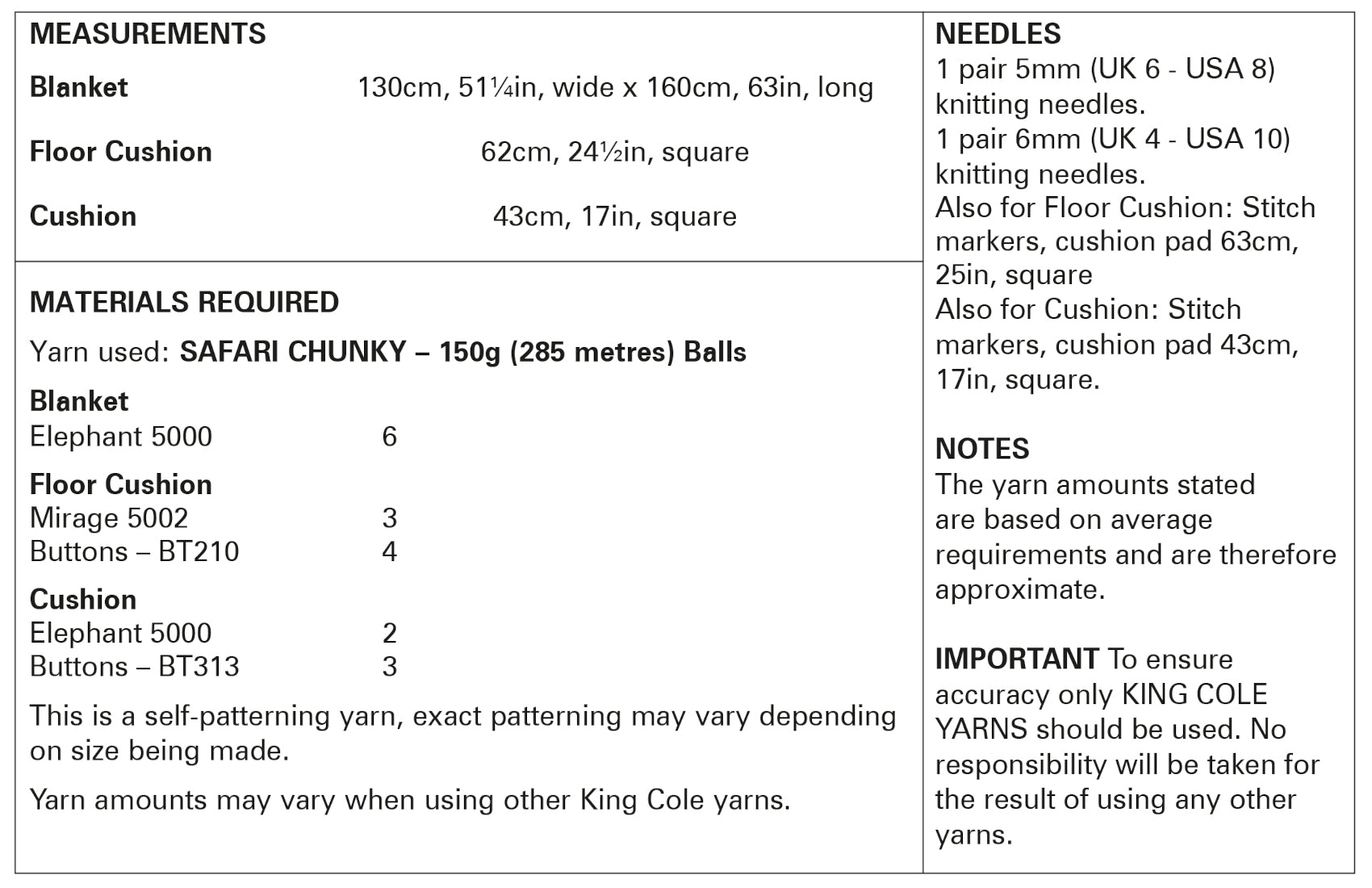 - Details: This is a King Cole knitting pattern that instructs you on how to knit a blanket, cushion and floor cushion, using Safari Chunky yarn.