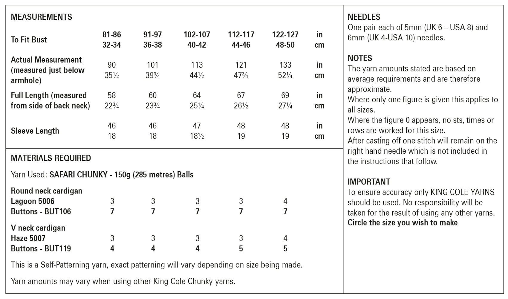 - Details: This is a King Cole knitting pattern that instructs you on how to knit a ladys cardigan with a round or v neck, using Safari Chunky yarn.