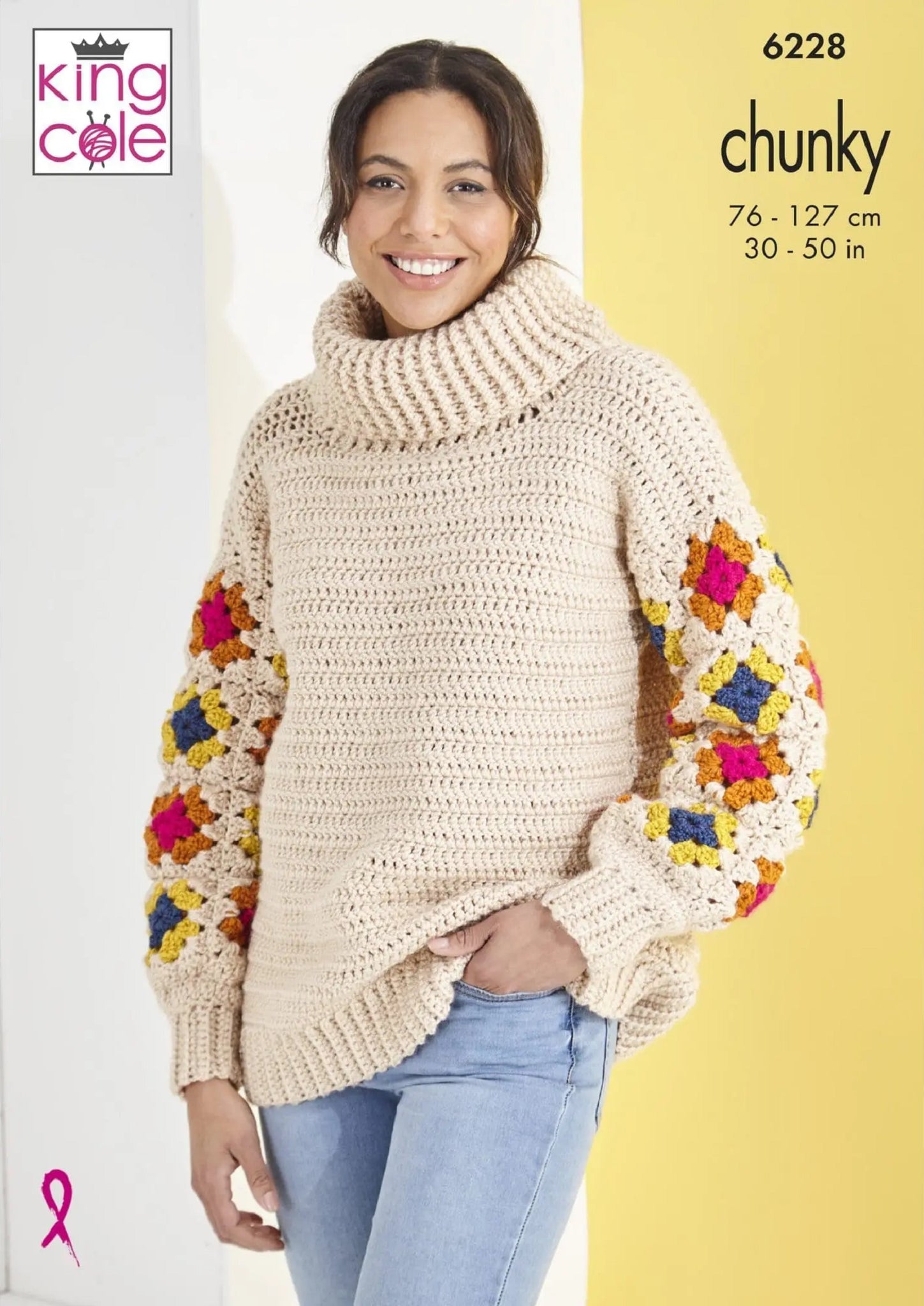 This chunky knitting pattern leaflet 6228 by King Cole will instruct you on how to create a Ladie granny square roll neck & crew neck jumpers.