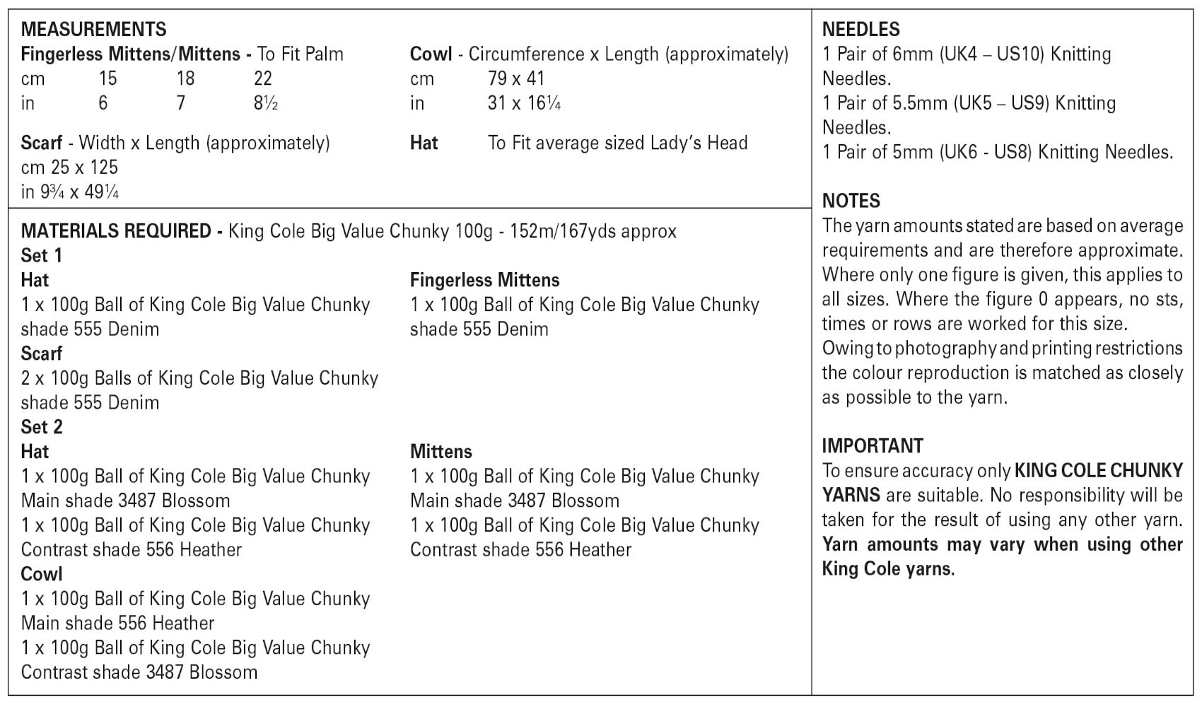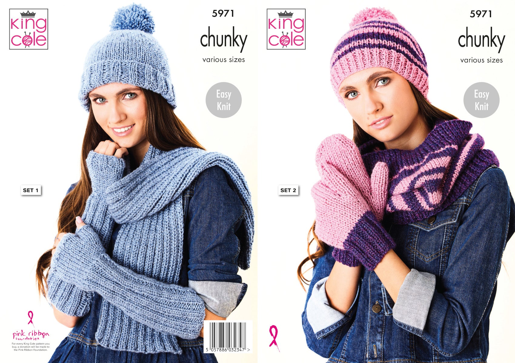 - Details: This is a King Cole knitting pattern that instructs you on how to knit a ladys scarf, cowl, mittens and hat, using Big Value Chunky yarn.