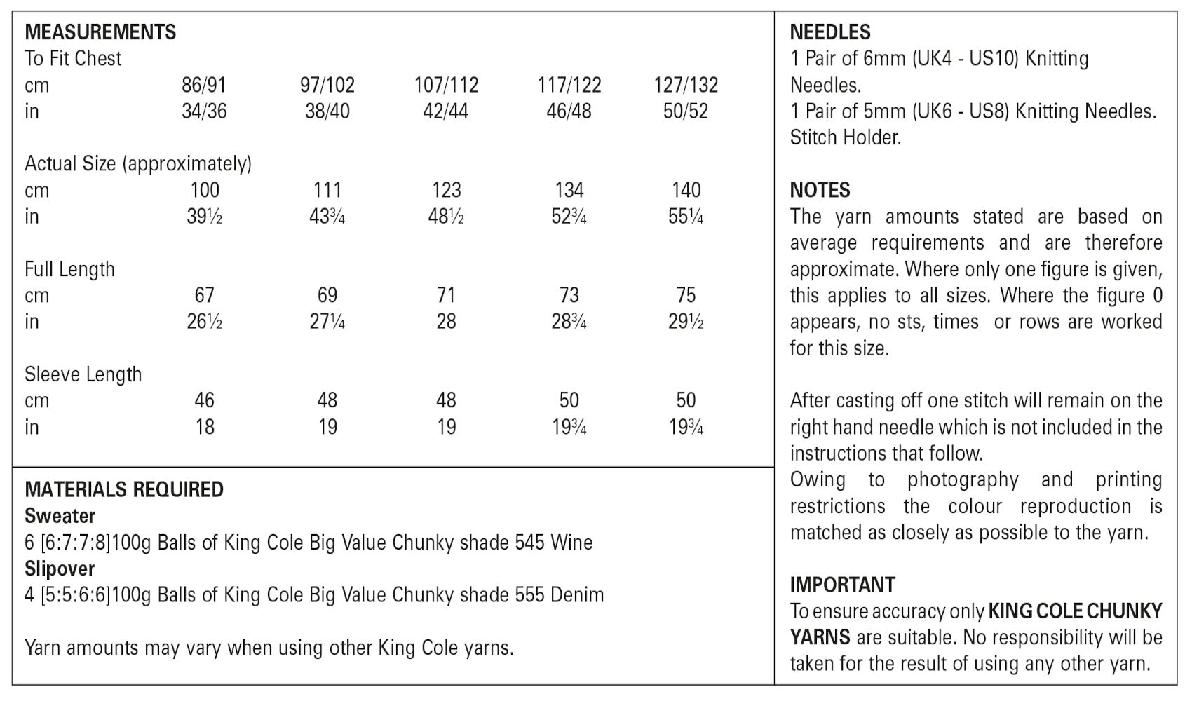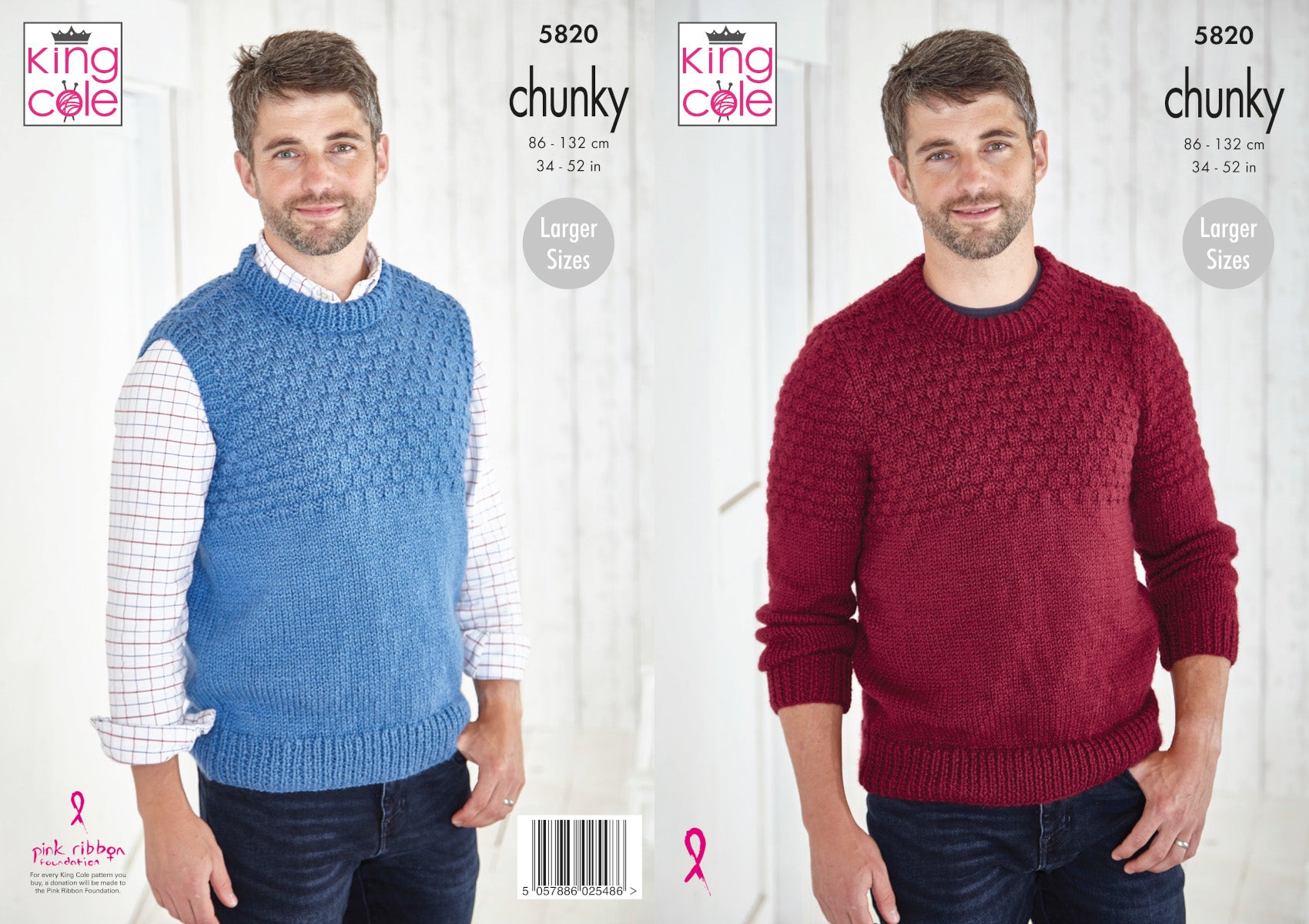 - Details: This is a King Cole chunky knitting pattern that instructs you on how to knit a man's sweater and slipover, using Big Value Chunky yarn.