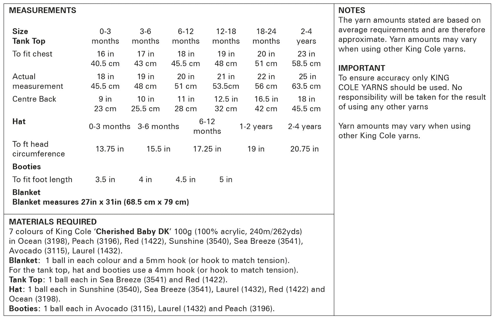 • Details: This is a King Cole baby double knit crochet pattern that instructs you on how to make a tank top, blanket, hat and booties, using Cherished Baby DK yarn.