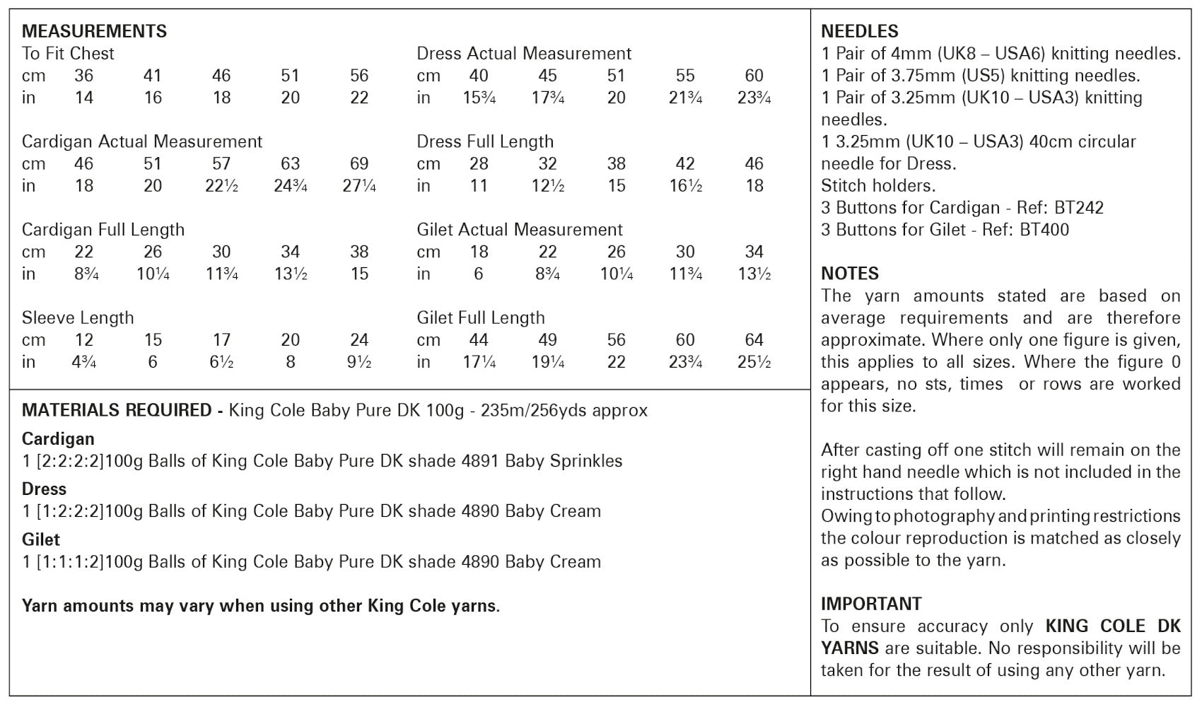 - Details: This is a King Cole baby double knit knitting pattern that instructs you on how to knit a cardigan, dress and gilet, using Baby Pure DK yarn.