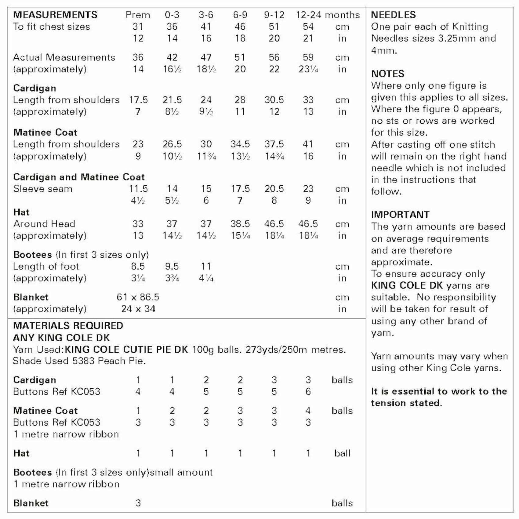 This baby double knit knitting pattern leaflet 6029 by King Cole will instruct you on how to create a cardigan, matinee coat, hat, bootees and blanket, all using an easy lace pattern.