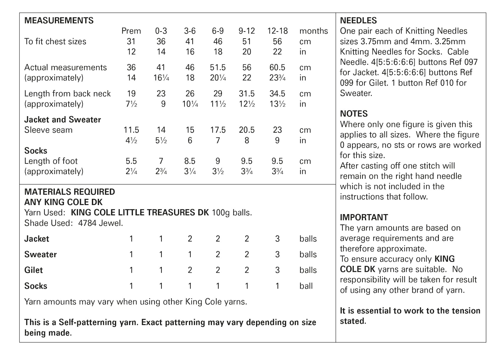 • Details: This is a King Cole baby double knit knitting pattern that instructs you on how to knit a jacket, gilet, sweater and socks, using Little Treasures DK yarn.