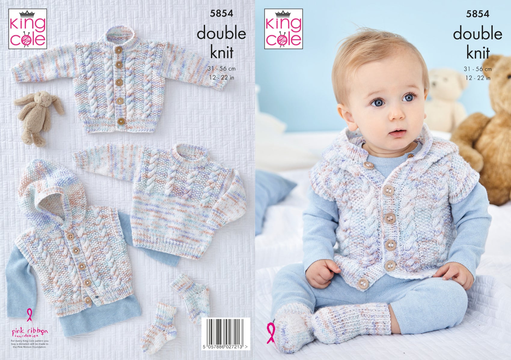 This baby double knit knitting pattern leaflet 5854 by King Cole will instruct you on how to create a jacket, sweater, gilet and socks, all with cable detail.