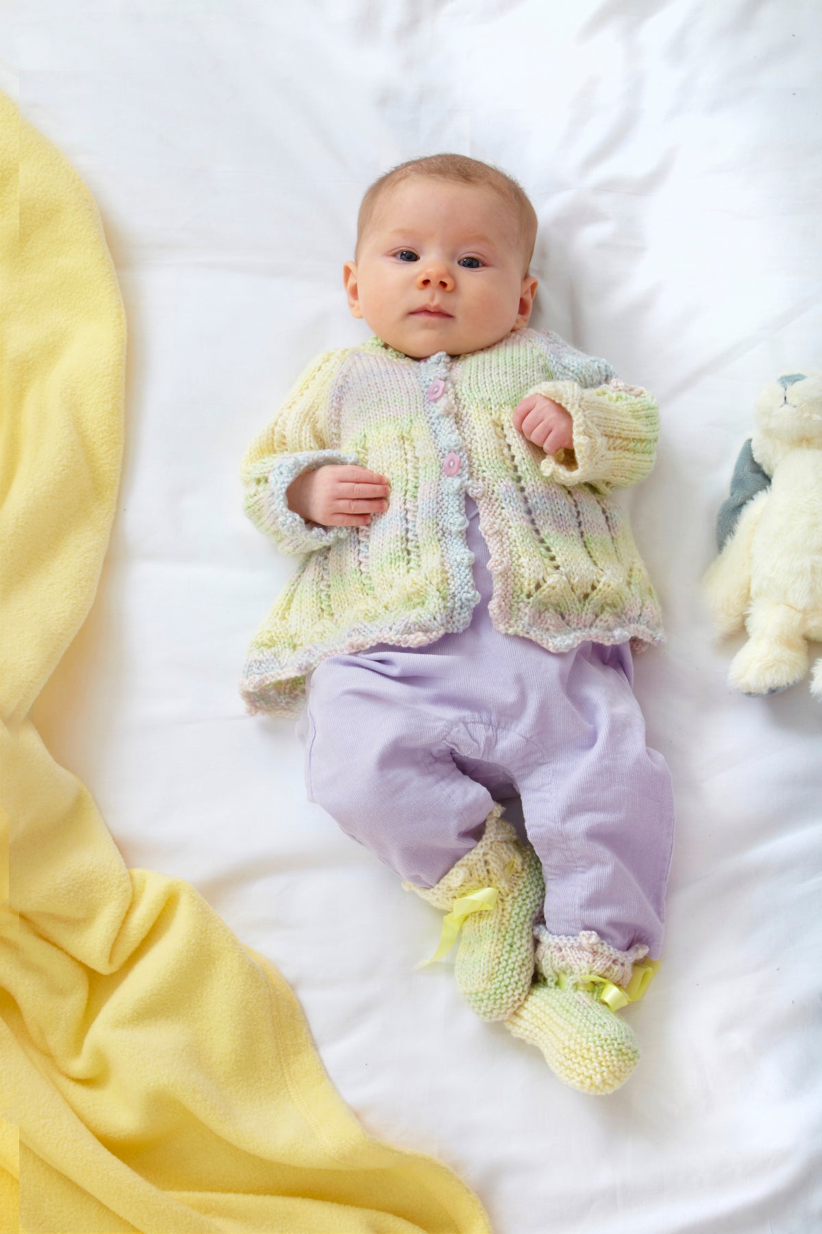 This baby double knit knitting pattern leaflet 6034 by King Cole will instruct you on how to create a raglan sleeve overtop, cardigan, matinee jacket and bootees, all with pretty lace detailing.