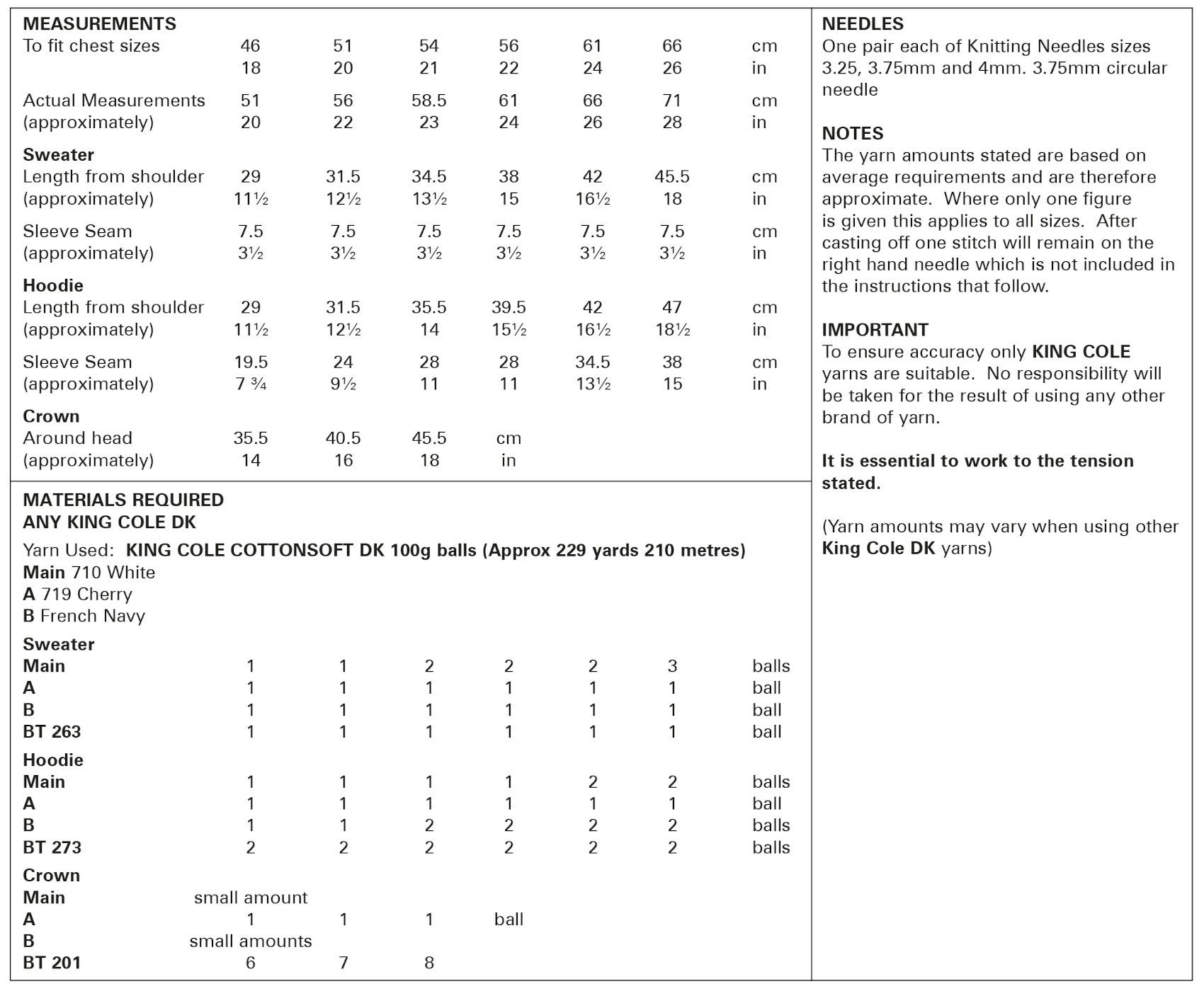 This King Cole knitting pattern is suitable for use with most double knit yarns, however tensions may vary and we recommend you knit a tension square before knitting the whole garment.