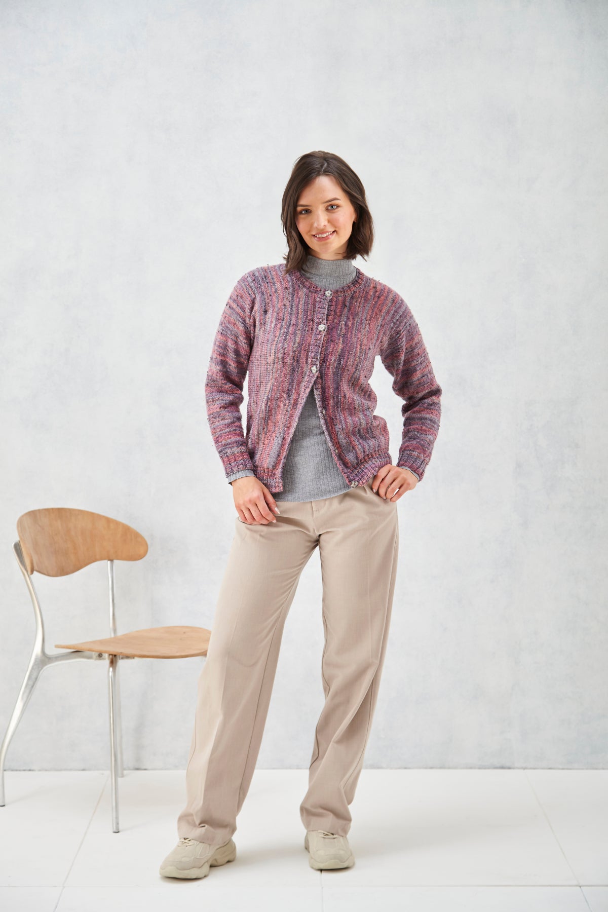 This double knit knitting pattern leaflet 5995 by King Cole will instruct you on how to create a lady's round neck or v neck cardigan.