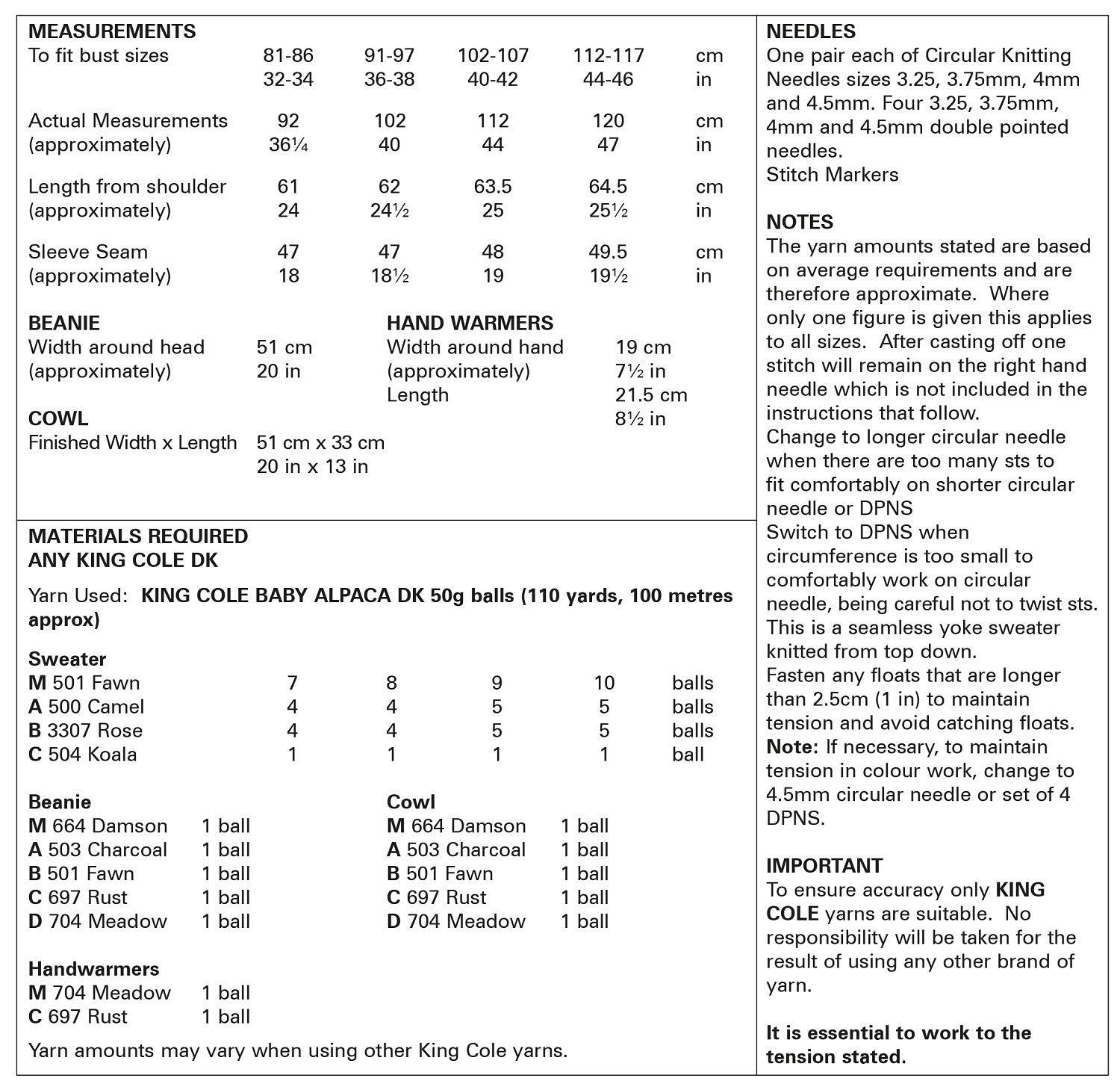 Details: This is a King Cole double knit pattern that instructs you how to knit a ladies ‘top down knit in the round’ fair isle sweater and accessories, using Baby Alpaca DK yarn.