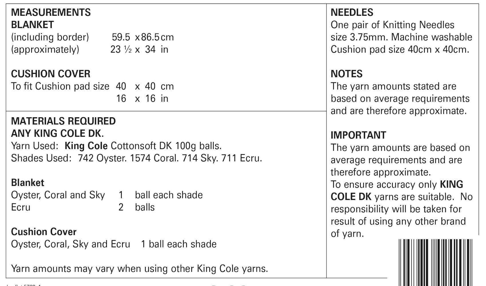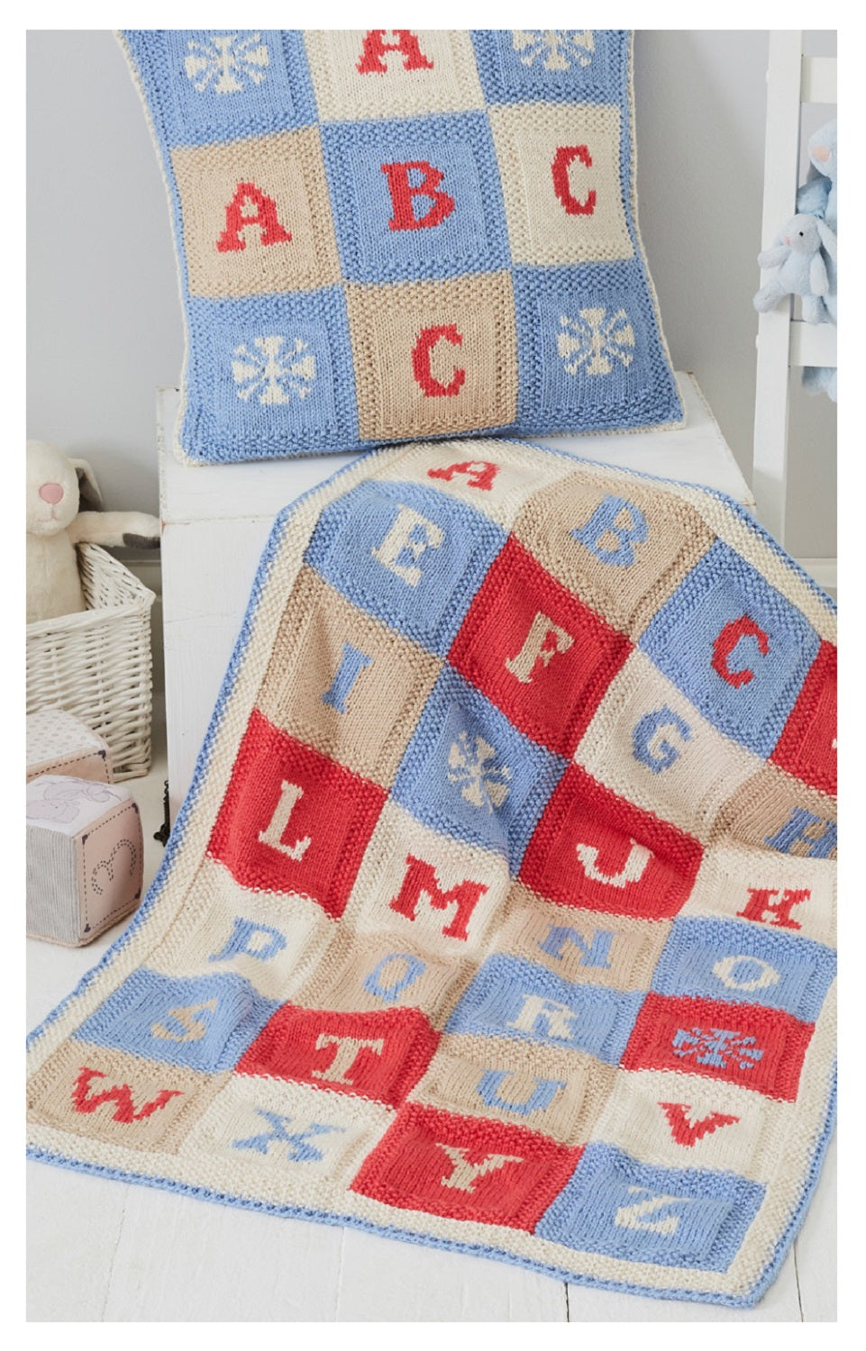 - Details: This is a King Cole baby double knit knitting pattern that instructs you on how to knit an alphabet blanket and cushion cover, using Cottonsoft DK yarn.