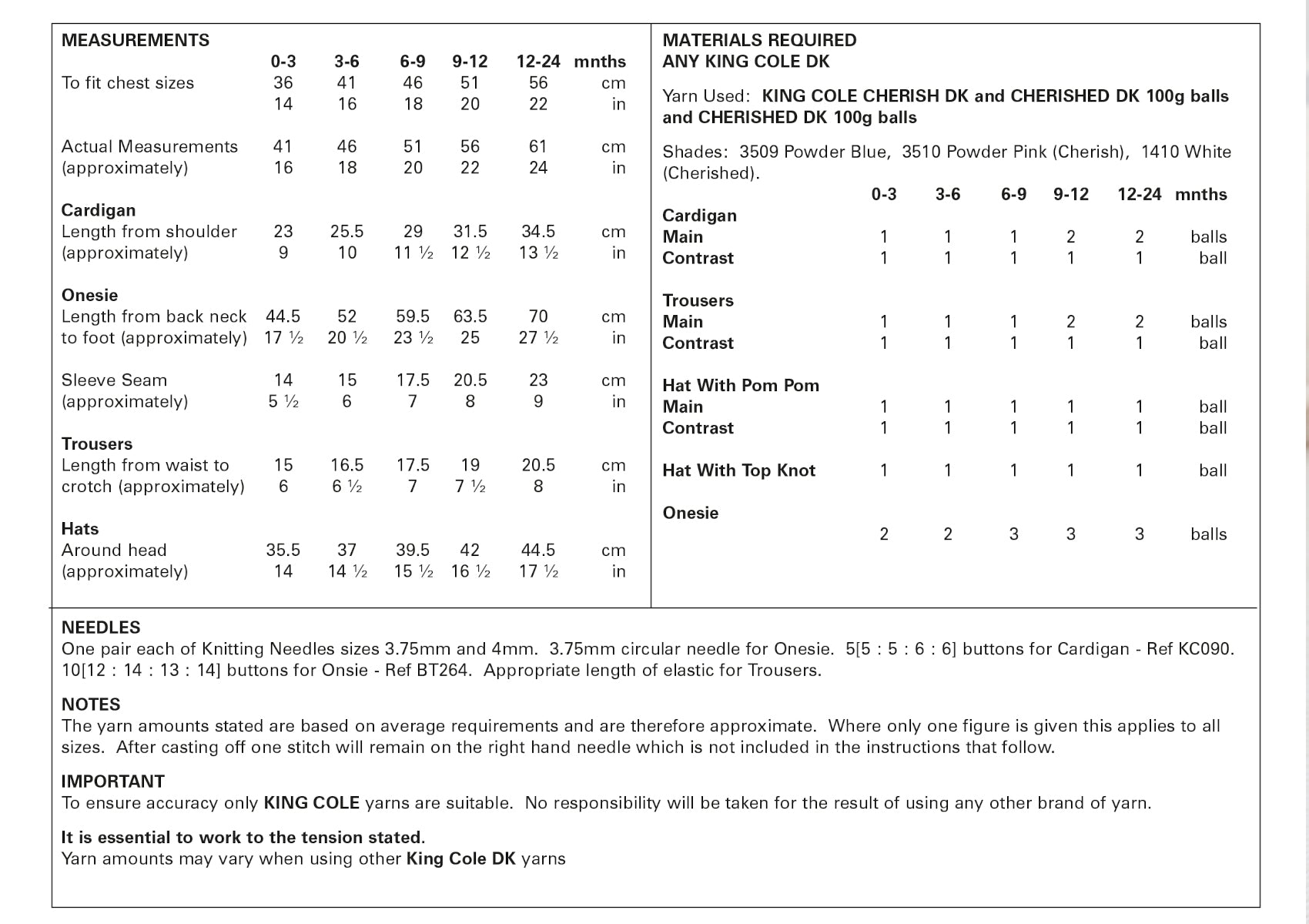 - Details: This is a King Cole baby knitting pattern that instructs you on how to knit a cardigan, all in one, trousers and hats, using Cherish DK & Cherished DK yarn.