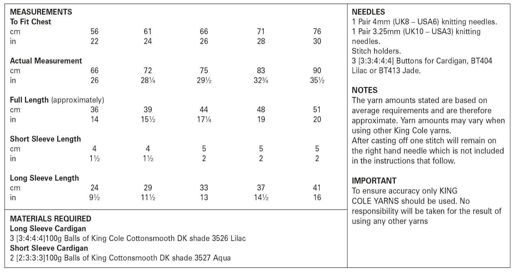 This King Cole knitting pattern is suitable for use with most double knit yarns, however tensions may vary and we recommend you knit a tension square before knitting the whole garment.
