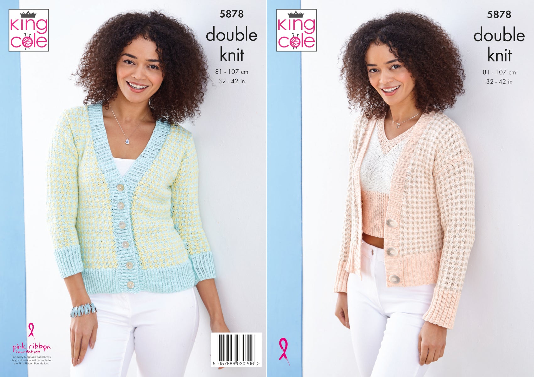 This double knit knitting pattern leaflet 5878 by King Cole will instruct you on how to create a lady's cardigan and a top.