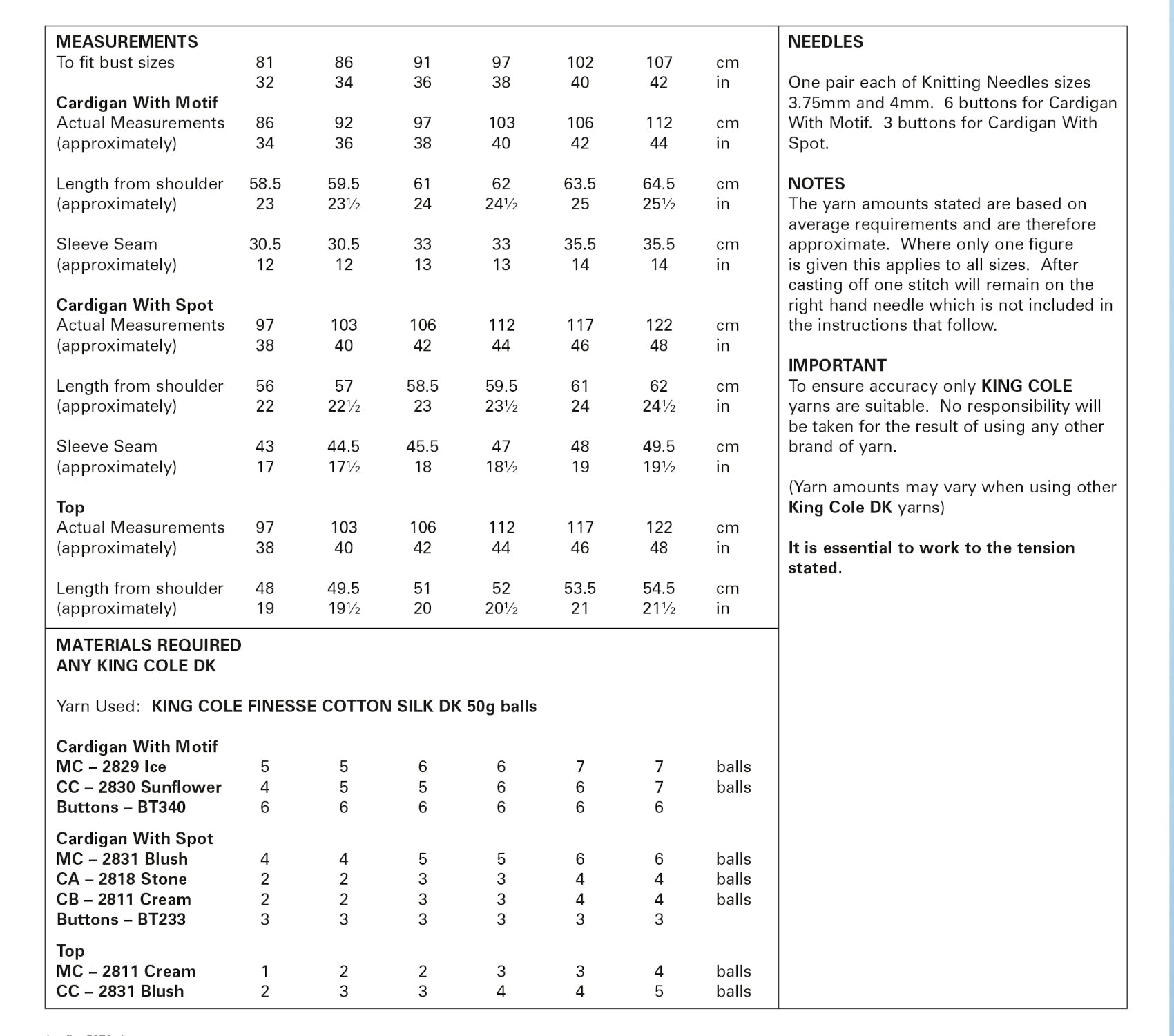 • Details: This is a King Cole double knit knitting pattern that instructs you on how to knit a lady's cardigan and top, using Finesse Cotton Silk DK yarn.