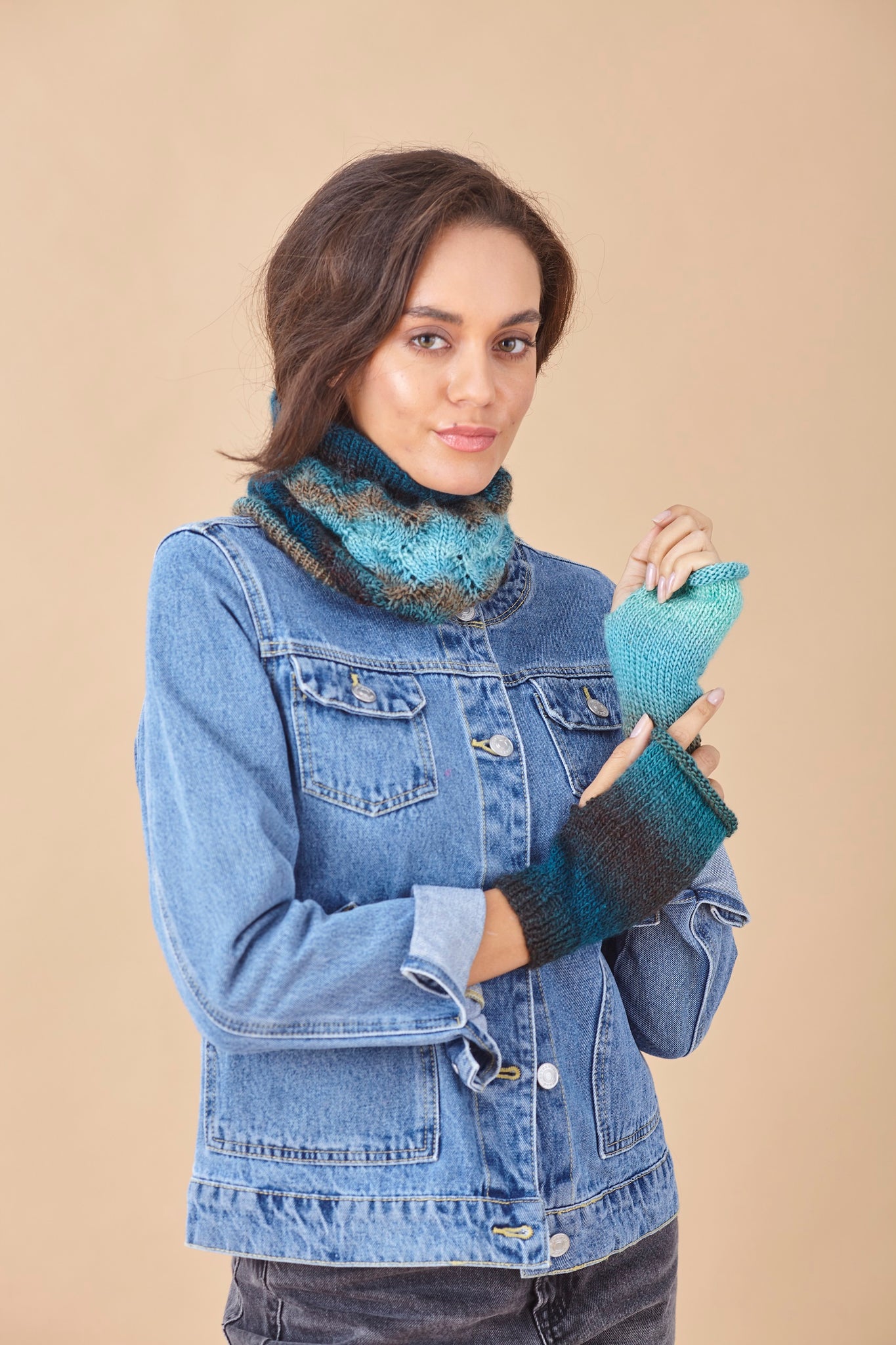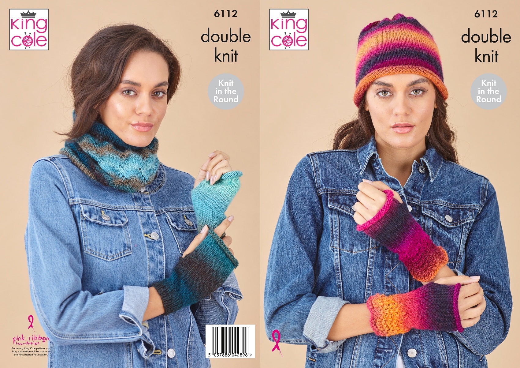 This double knit knitting pattern leaflet 6112 by King Cole will instruct you on how to create a variety of ladies accessories: Sloppy hat, Cowl and 2 Hand Warmer designs.