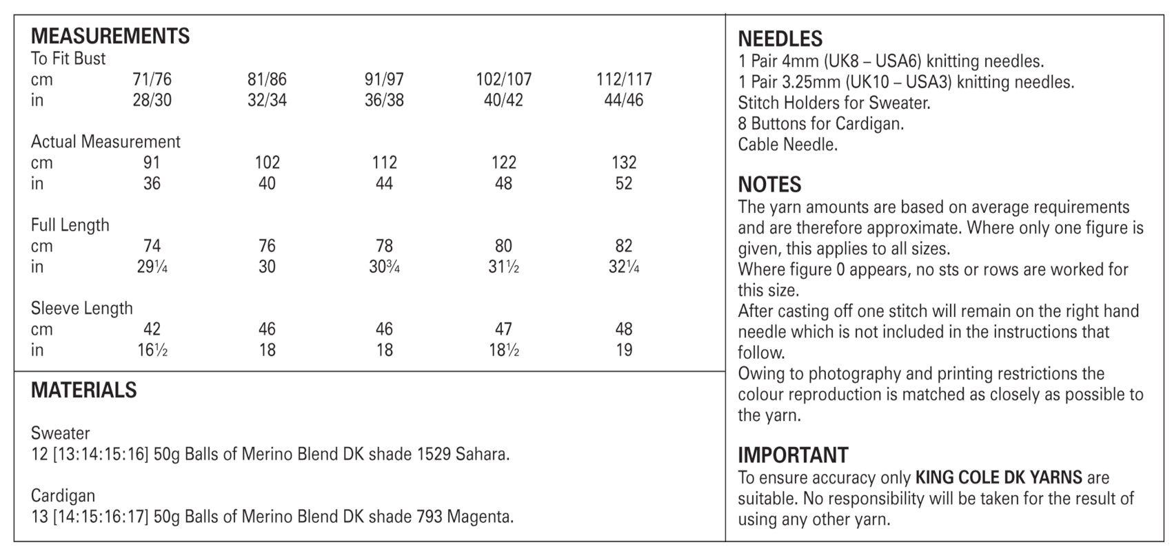 This King Cole knitting pattern is suitable for use with most double knit yarns, however tensions may vary and we recommend you knit a tension square before knitting the whole garment.