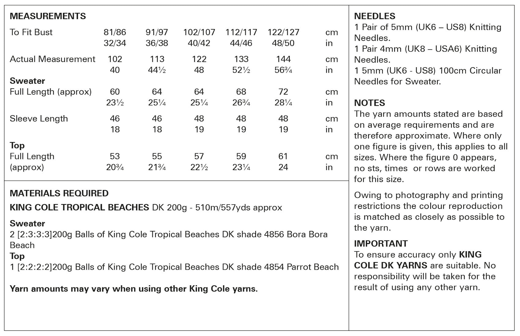 - Details: This is a King Cole double knit knitting pattern that instructs you on how to knit a ladys sweater and top, using Tropical Beaches DK yarn.
