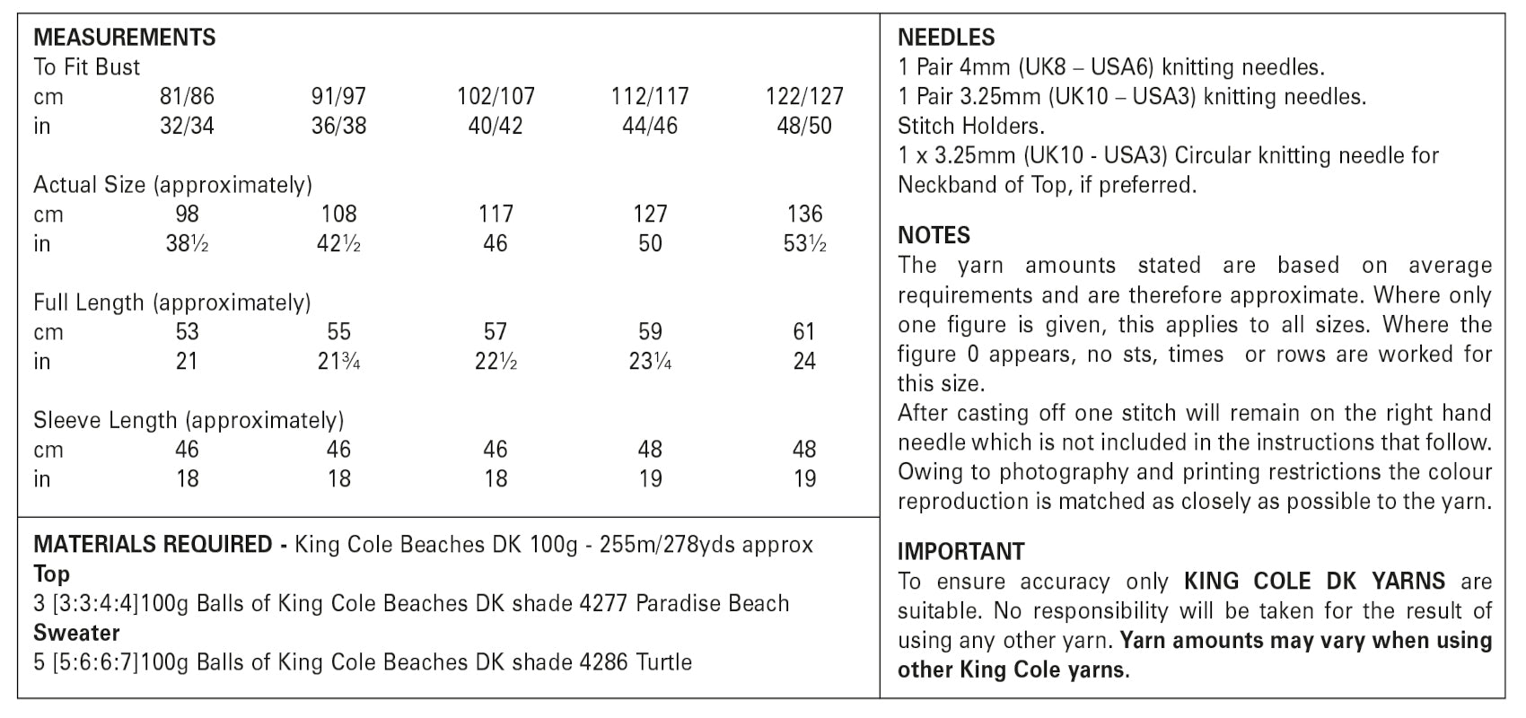 • Details: This is a King Cole double knit knitting pattern that instructs you on how to knit a lady's top and sweater, using Beaches DK yarn.