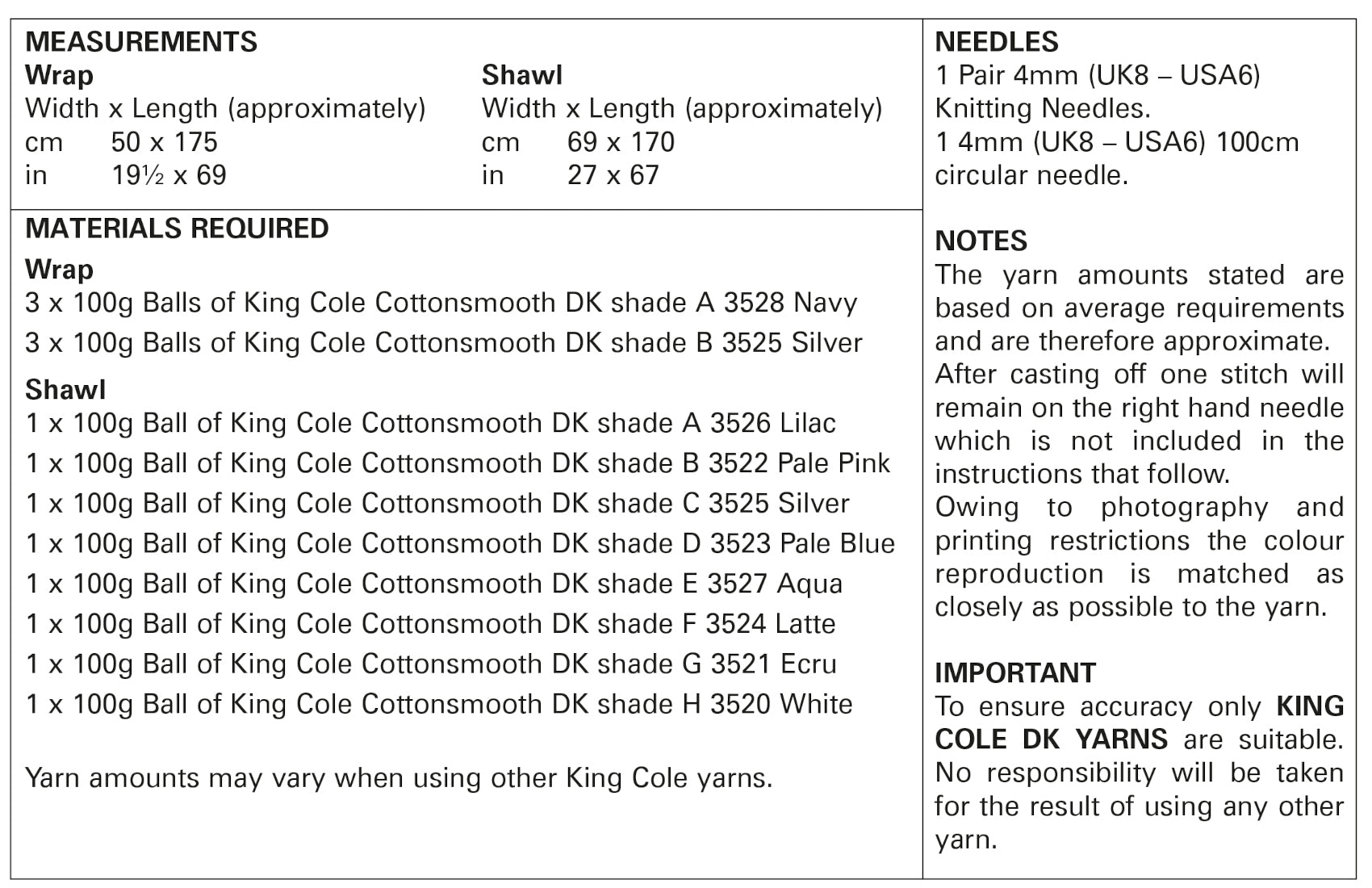 - Details: This is a King Cole knitting pattern that instructs you on how to knit a lady's wrap and shawl, using Cottonsmooth DK yarn.