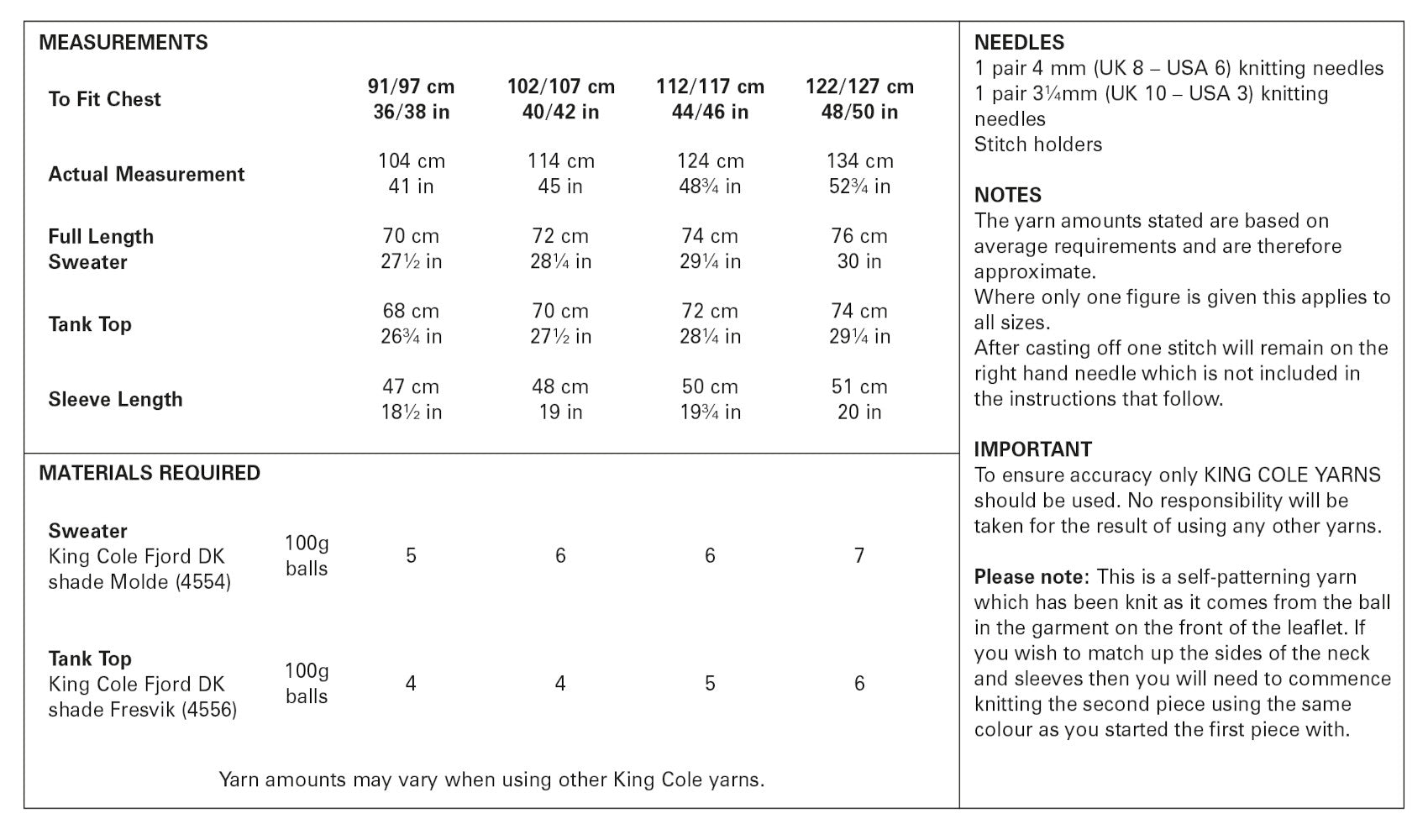 - Details: This is a King Cole knitting pattern that instructs you on how to knit a man's sweater and tank top, using Fjord DK yarn.