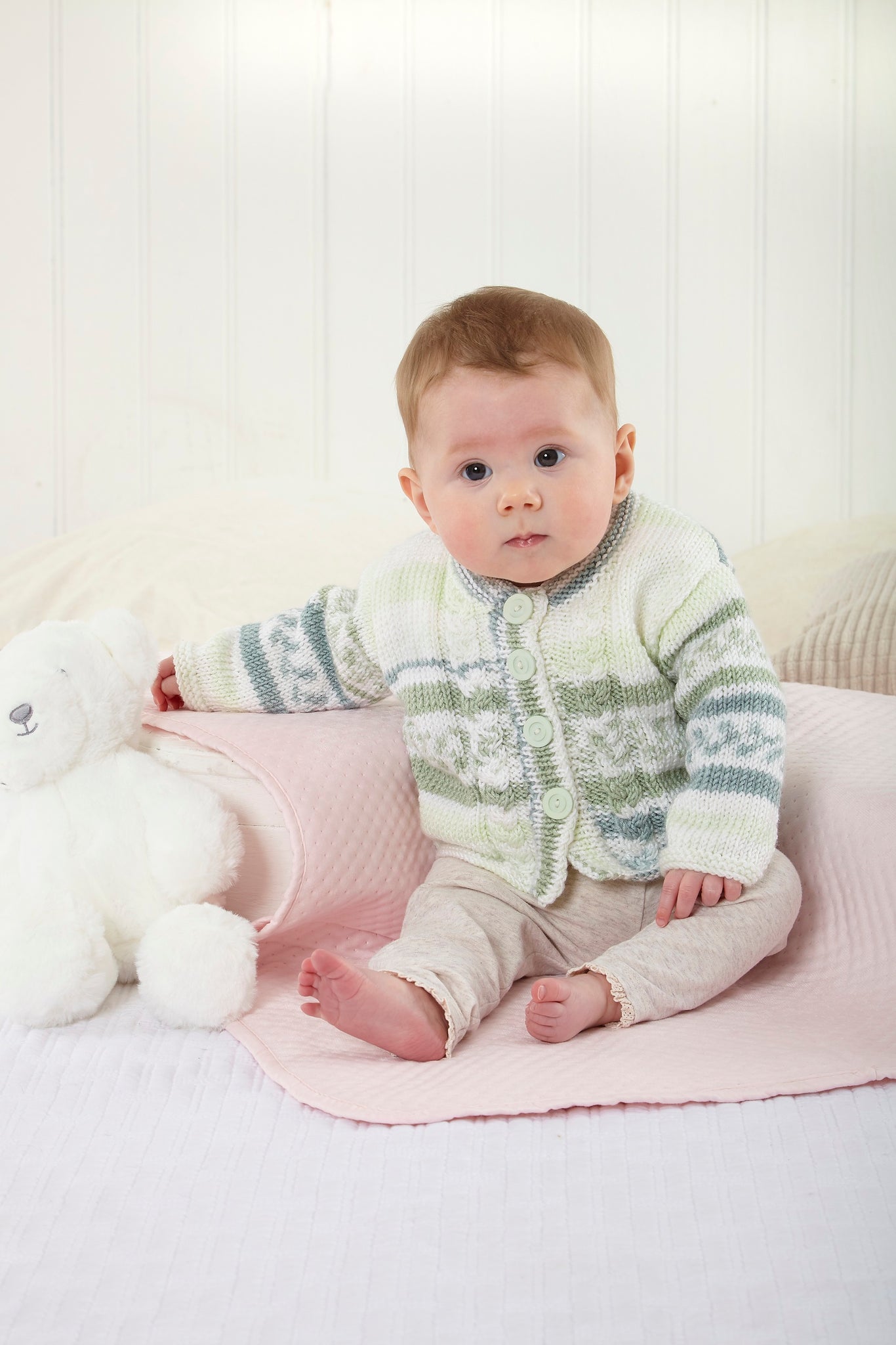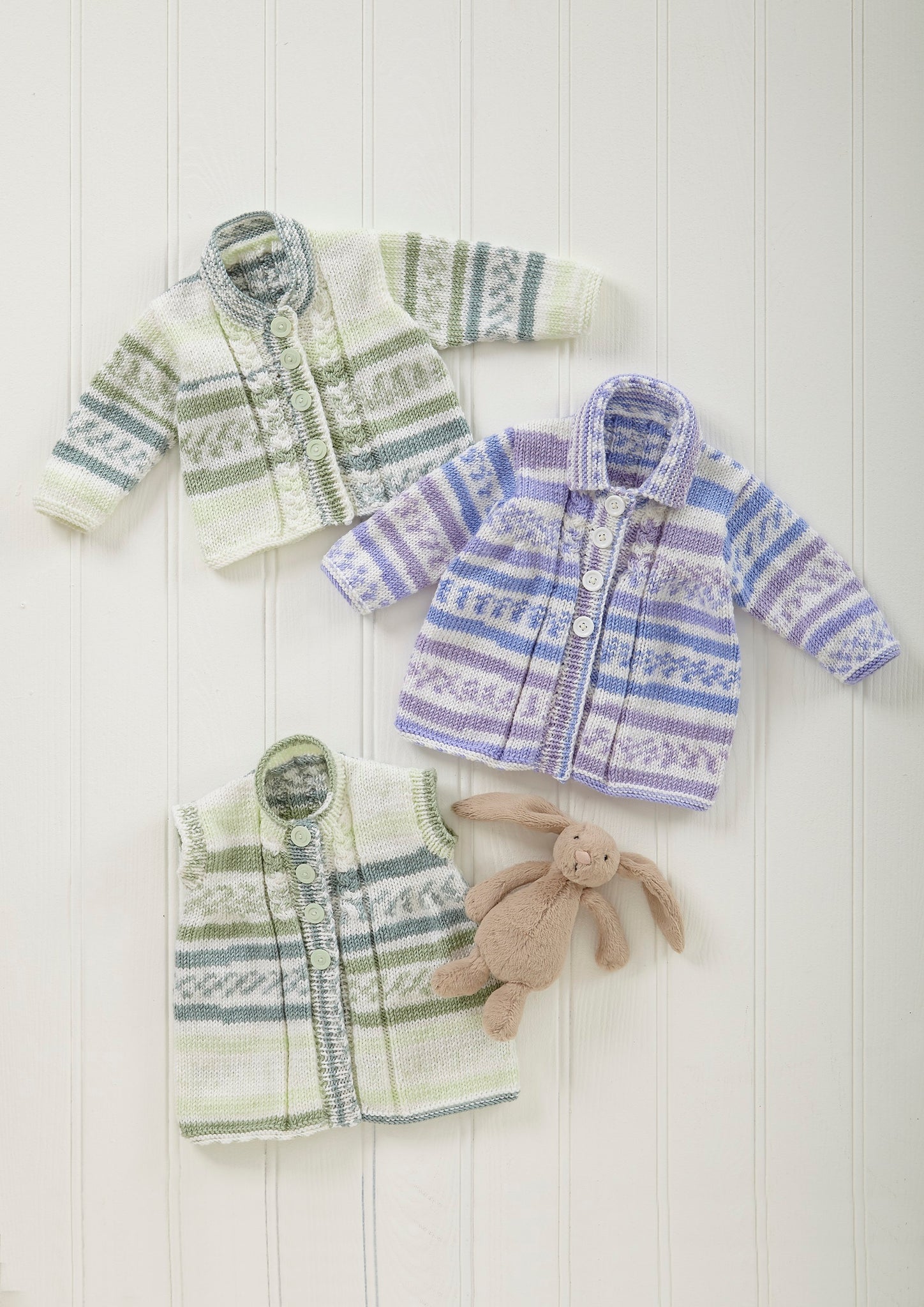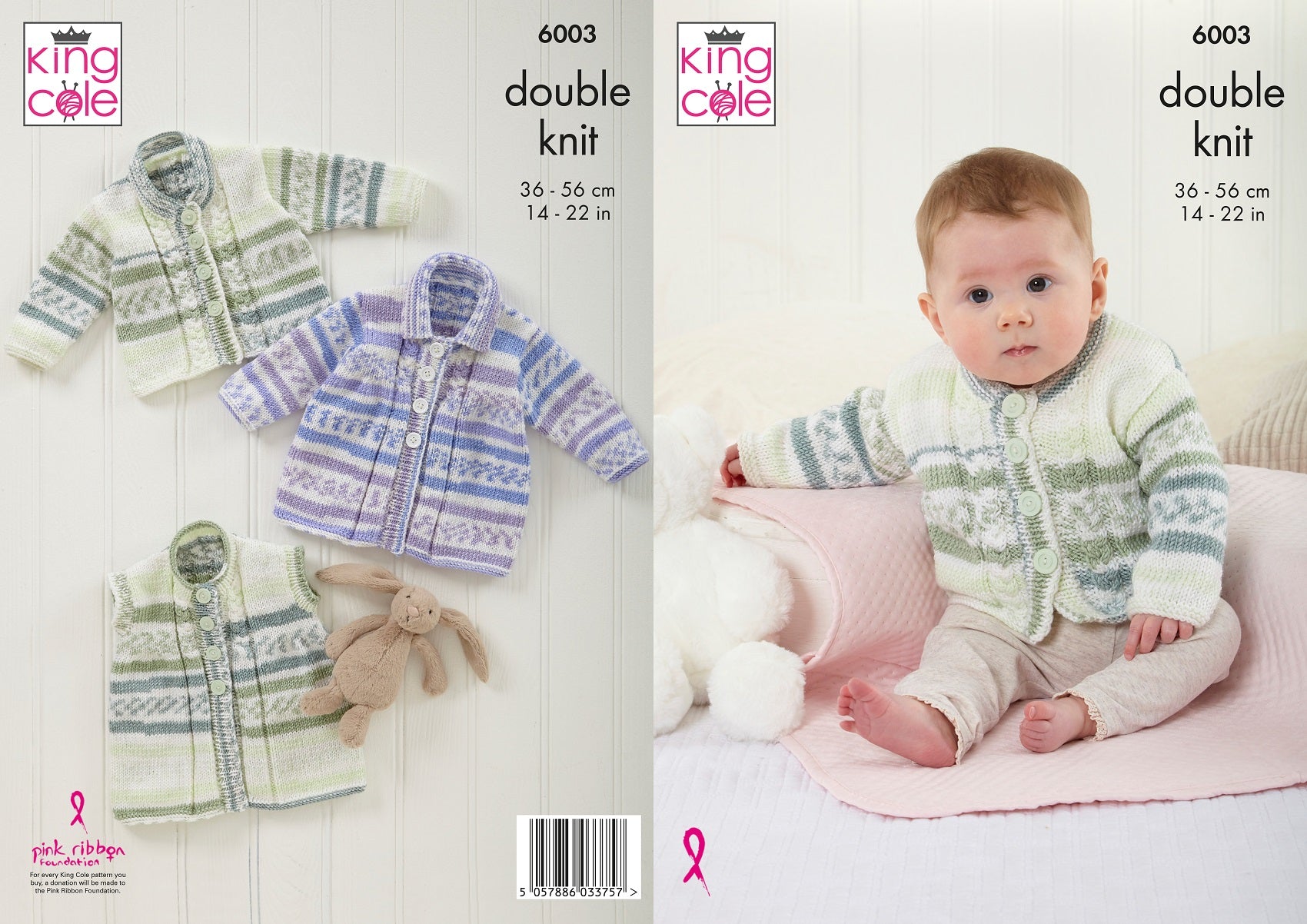 This baby double knitting pattern leaflet 6003 by King Cole will instruct you on how to create a cosy jacket,waistcoat and cardigan.