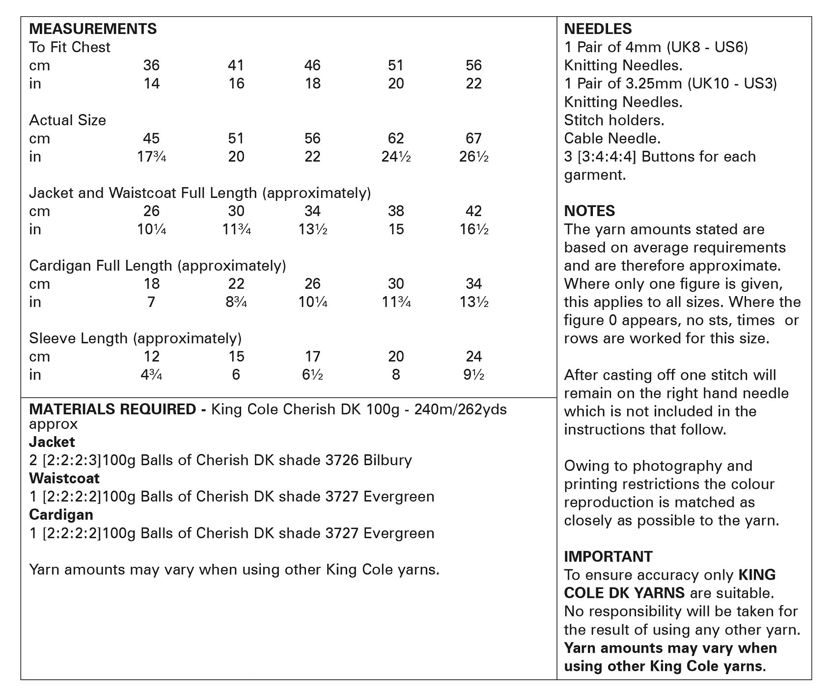 This knitting pattern is suitable for King Cole yarns only.Tensions may vary and we recommend you knit a tension square before knitting the whole garment.