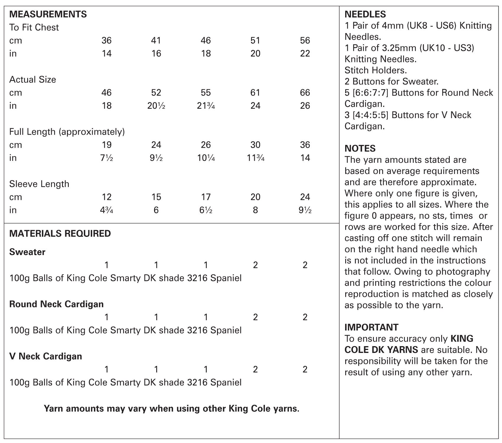 This King Cole knitting pattern is suitable for use with most double knit yarns, however tensions may vary and we recommend you knit a tension square before knitting the whole garment.