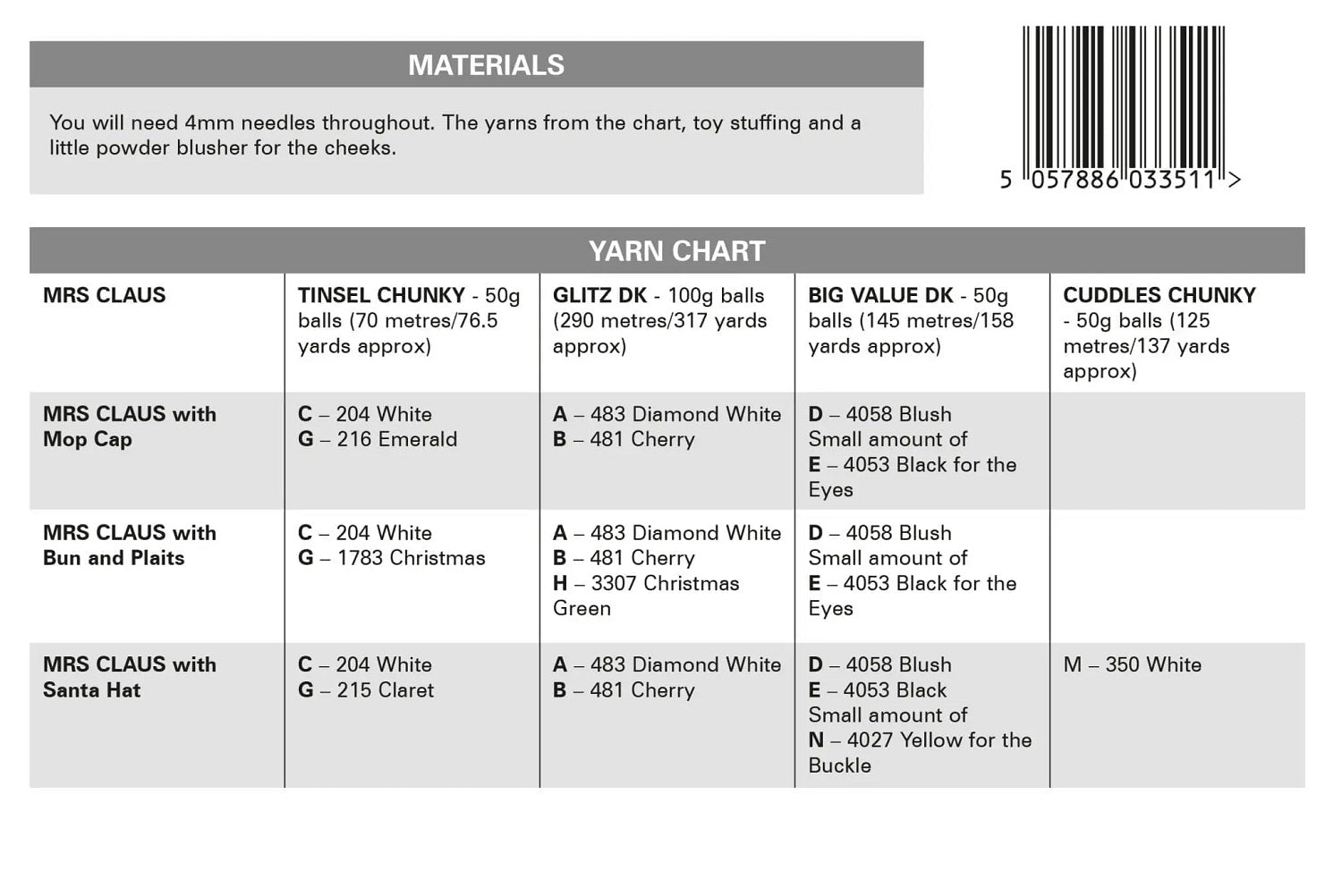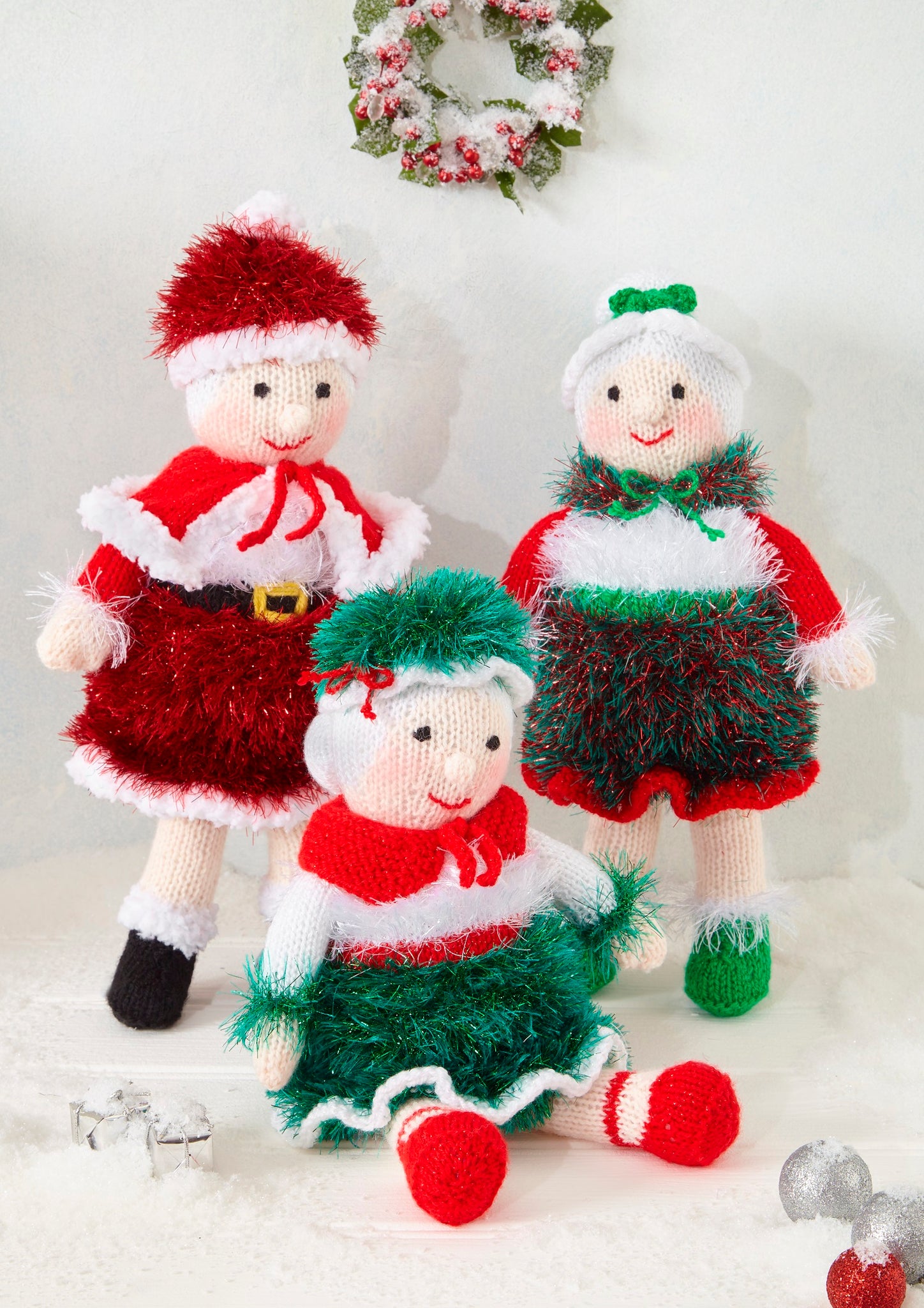 Details: This is a King Cole knitting pattern that instructs you how to knit a variety of knitted Mrs Santa Clause Dolls, using Tinsel chunky, Glitz DK & Big Value DK yarn.