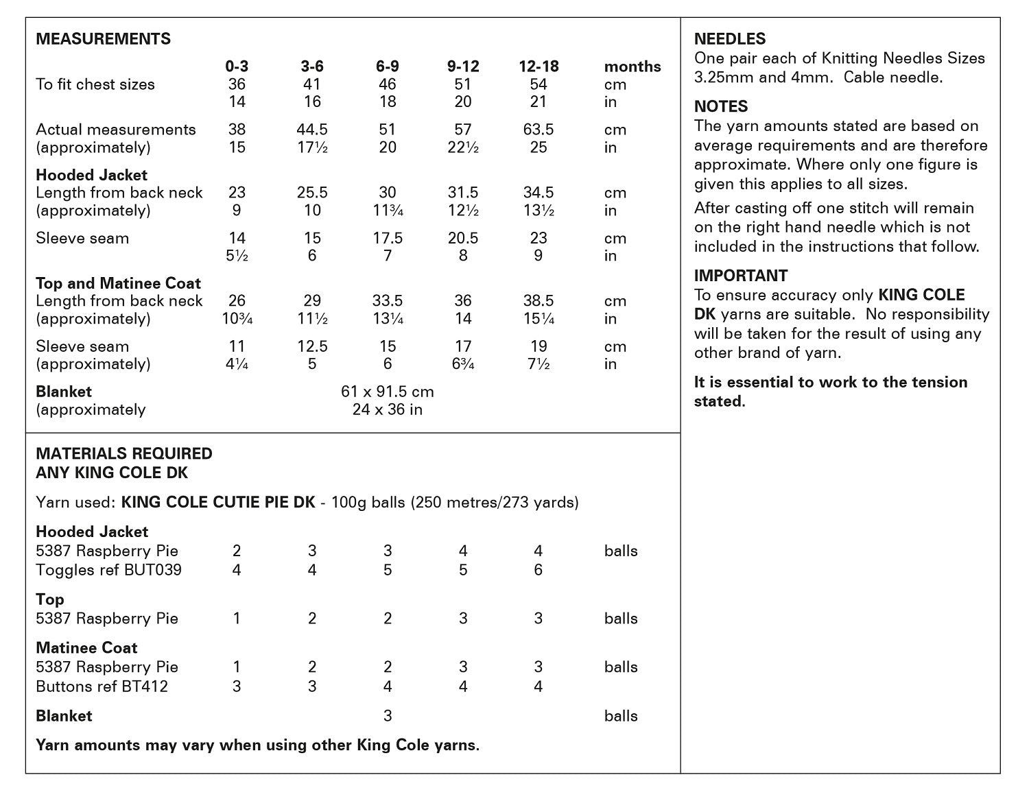 Details: This is a King Cole baby knitting pattern that instructs you on how to knit a Jacket,Top, Matinee Coat & Blanket, using Cutie Pie DK yarn.