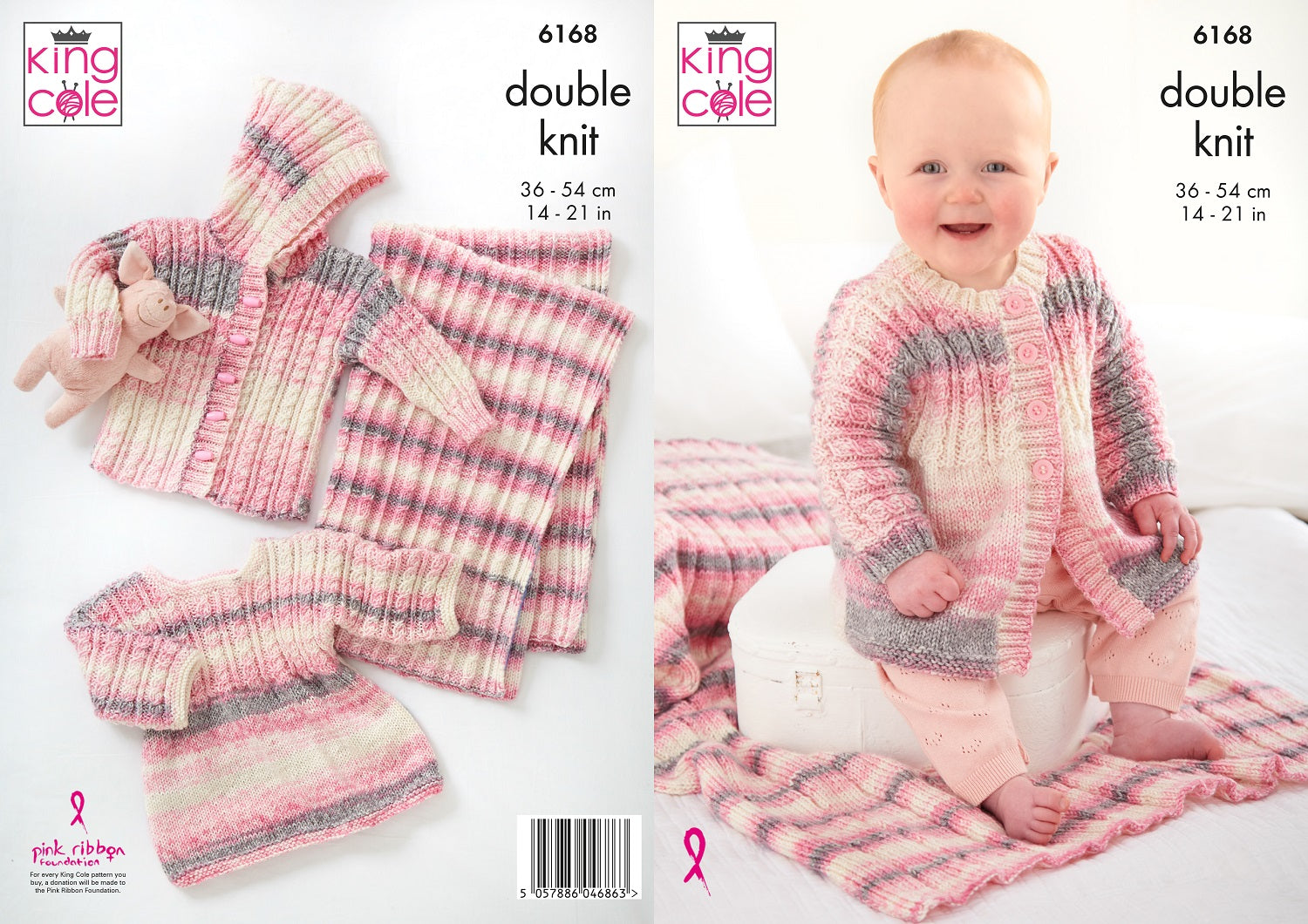 This baby double knit knitting pattern leaflet 6168 by King Cole will instruct you on how to create a jacket, top, matinee coat & blanket