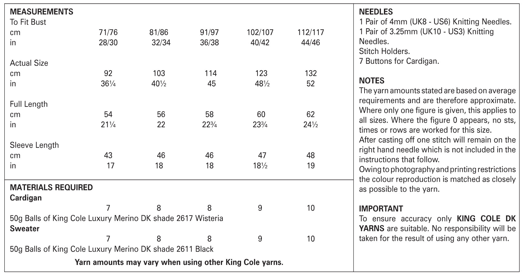 This King Cole knitting pattern is suitable for use with most double knit yarns, however tensions may vary and we recommend you knit a tension square before knitting the whole garment.