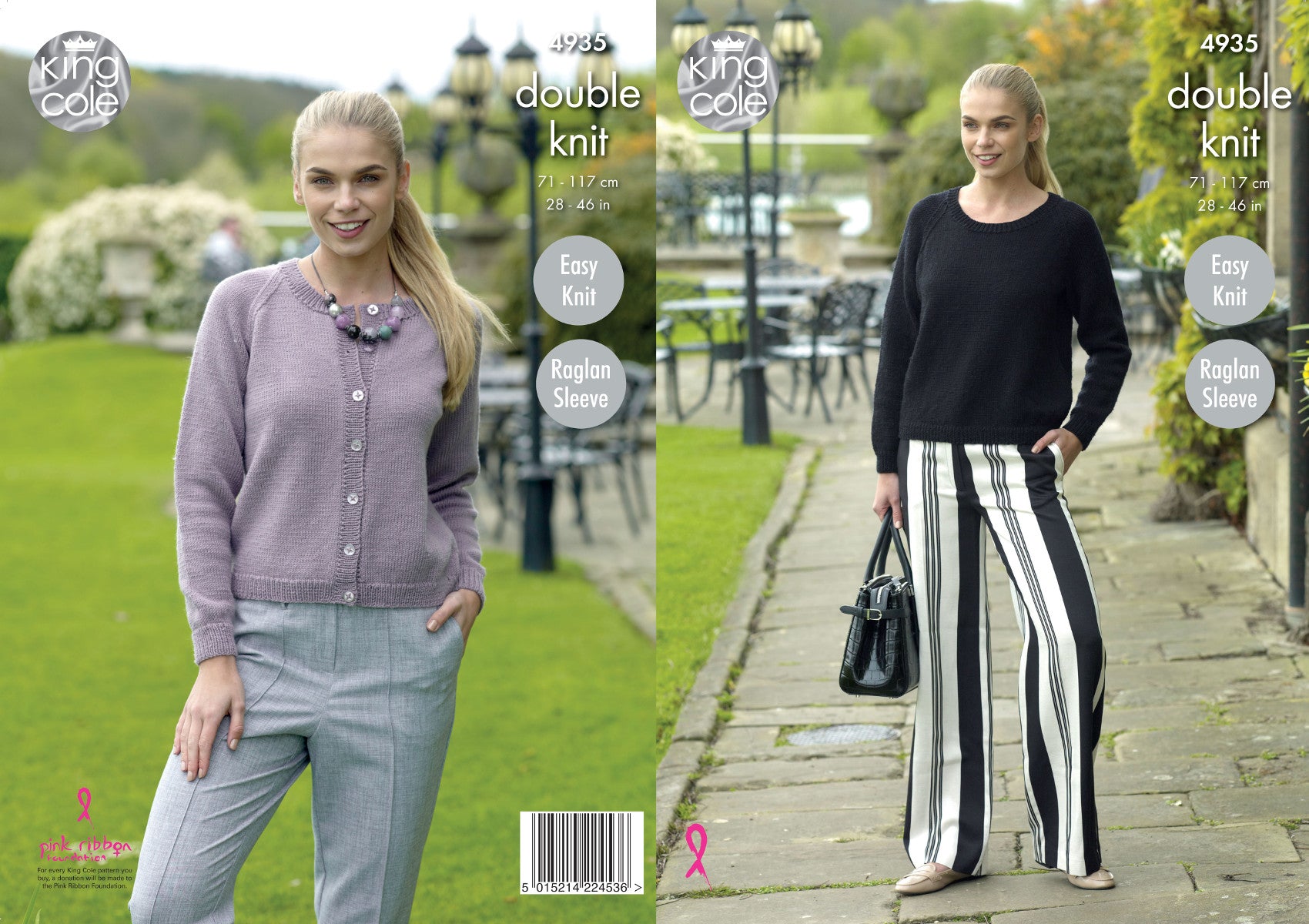 This easy knit double knitting pattern leaflet 4935 by King Cole will instruct you on how to create a lady's raglan sleeve sweater and cardigan.