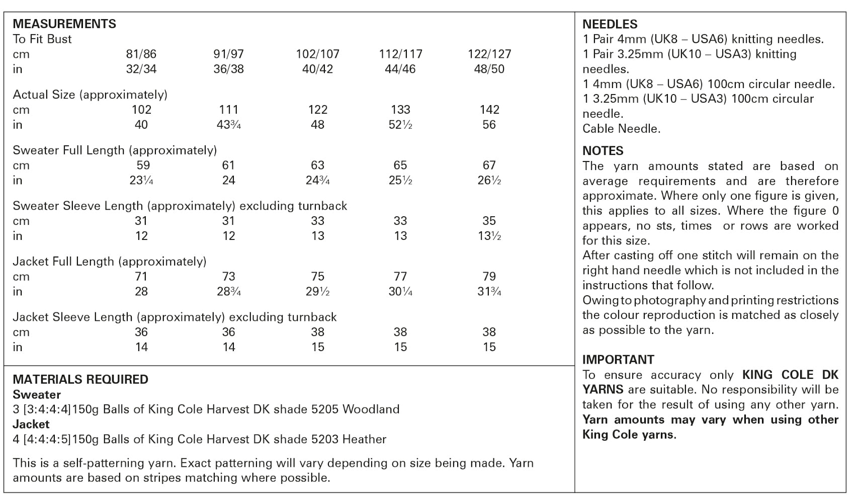 • Details: This is a King Cole knitting pattern that instructs you on how to knit a lady's sweater and jacket with cable detail, using Harvest DK yarn.