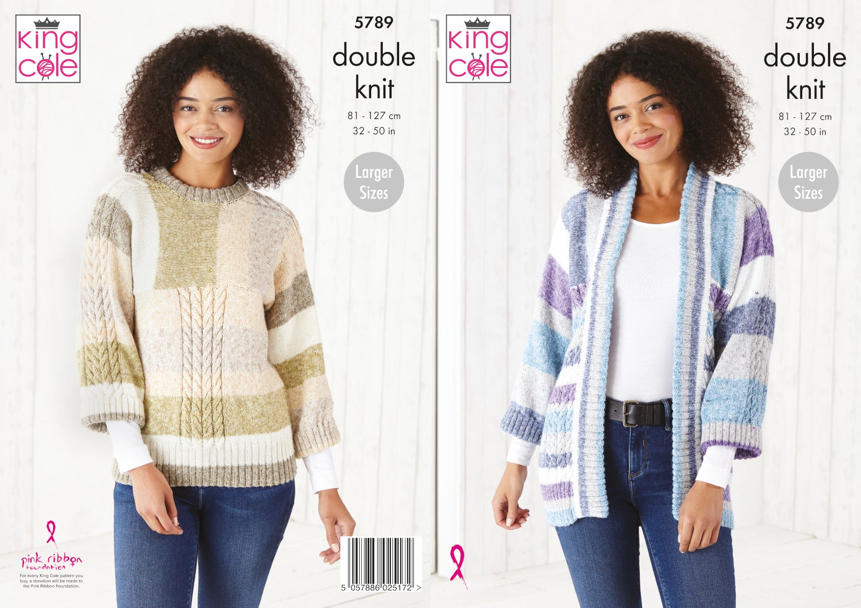 This double knit knitting pattern leaflet 5789 by King Cole will instruct you on how to create a lady's cable detail sweater and jacket.