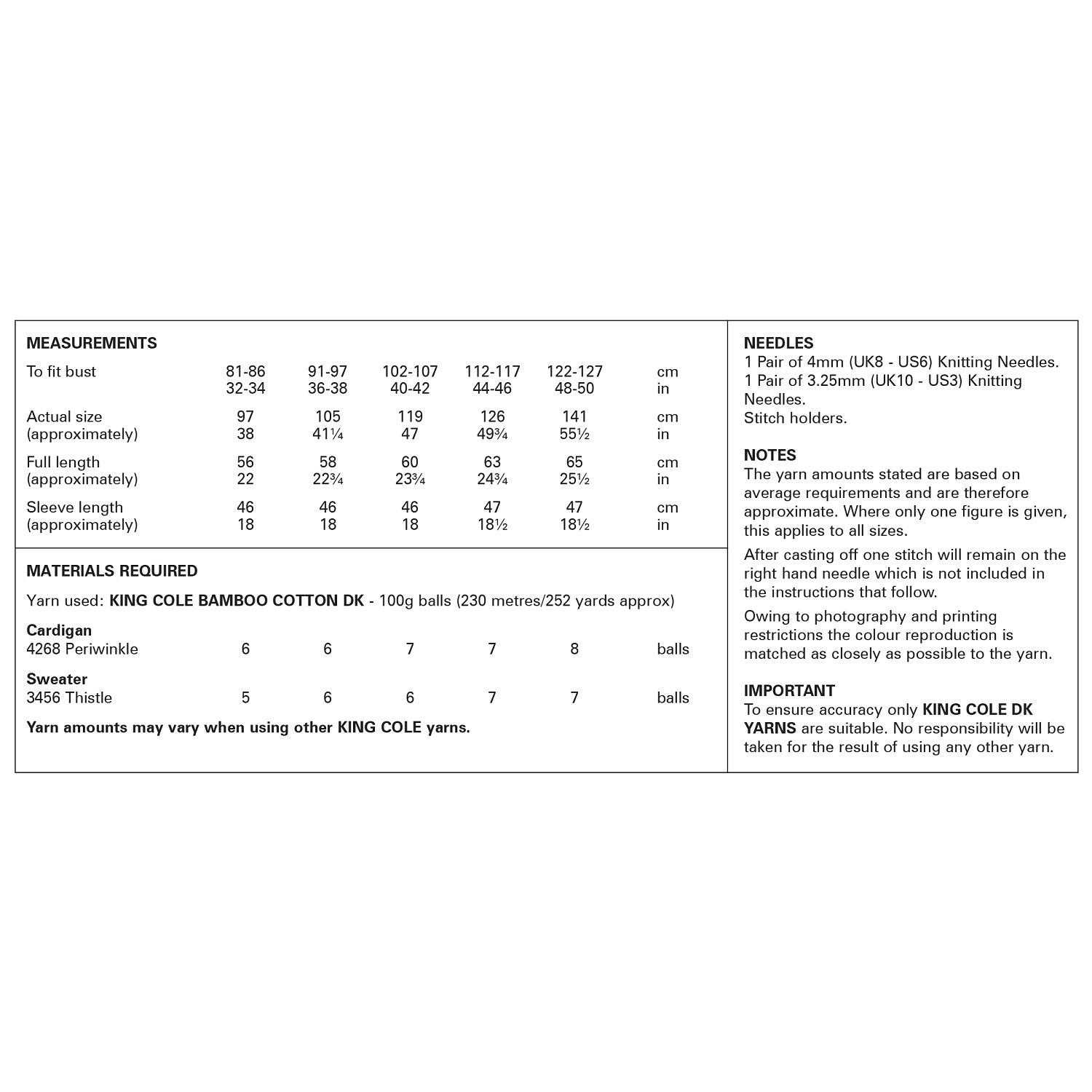Details: This is a King Cole double knitting pattern that instructs you on how to knit a ladies sweater and cardigan with cut out detail, using Bamboo Cotton DK yarn.
