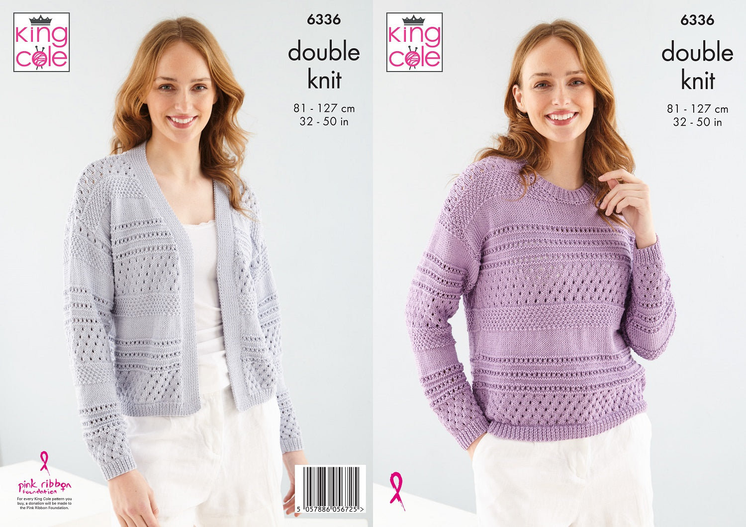 This double knit knitting pattern leaflet 6336 by King Cole will instruct you on how to create a ladies sweater & cardigan.
