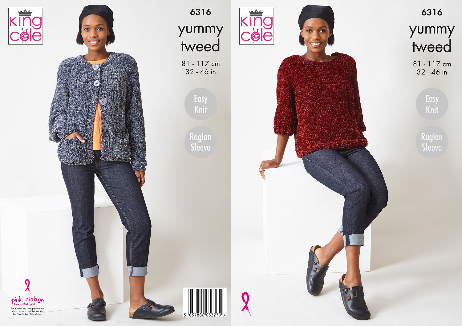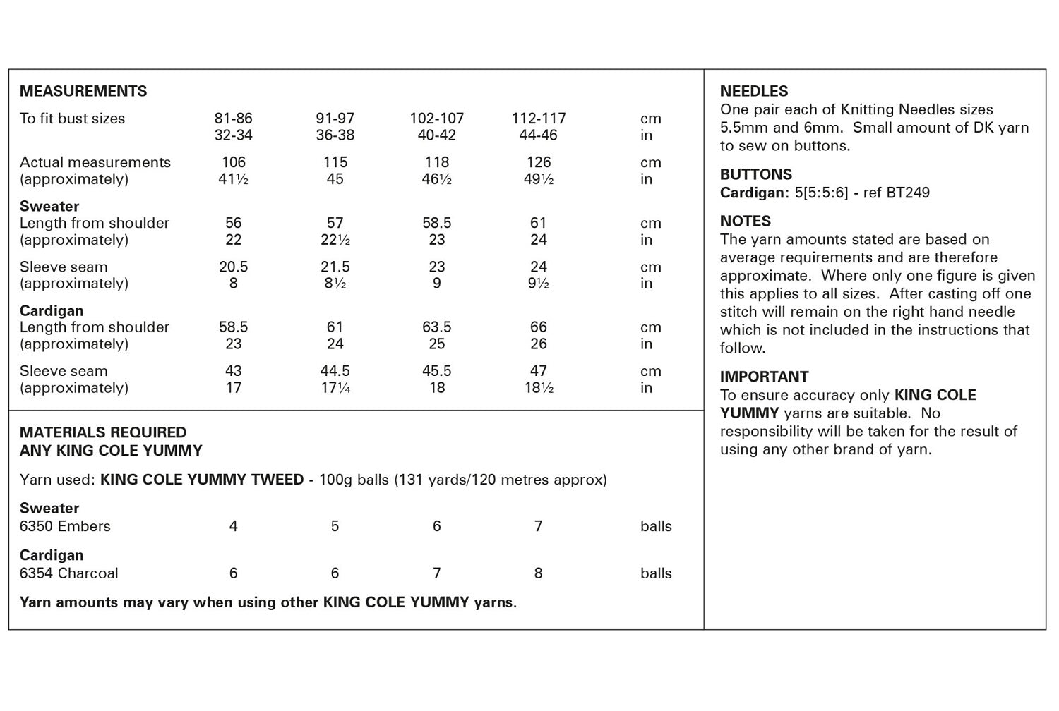 Details: This is a King Cole easy knit pattern that instructs you how to knit a ladies soft sweater & cardigan, using Yummy Tweed yarn.
