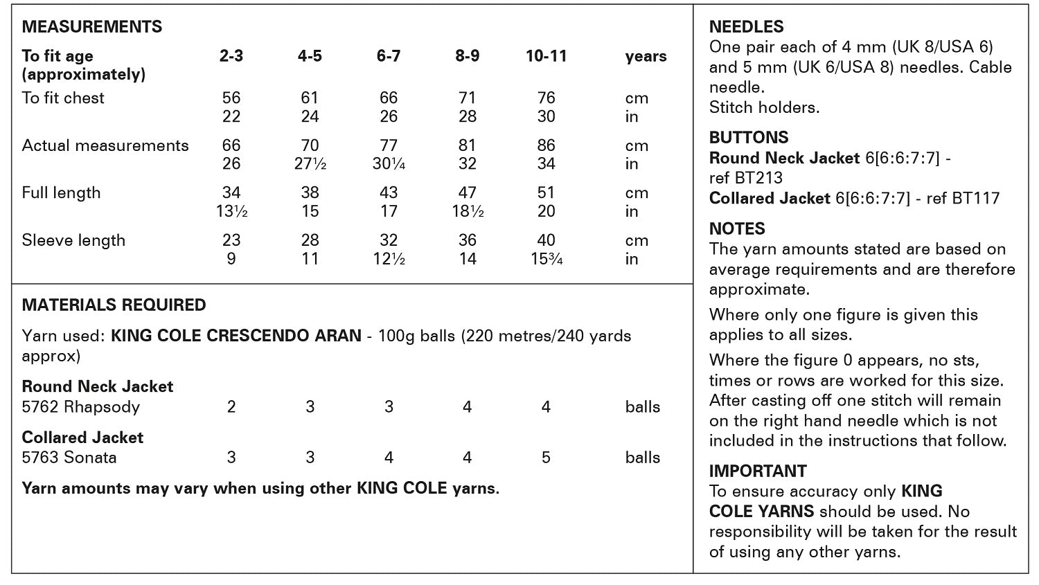 Details: This is a King Cole children's knitting pattern that instructs you how to knit a round neck jacket & collared jacket cardigan, using Crescendo Aran yarn.