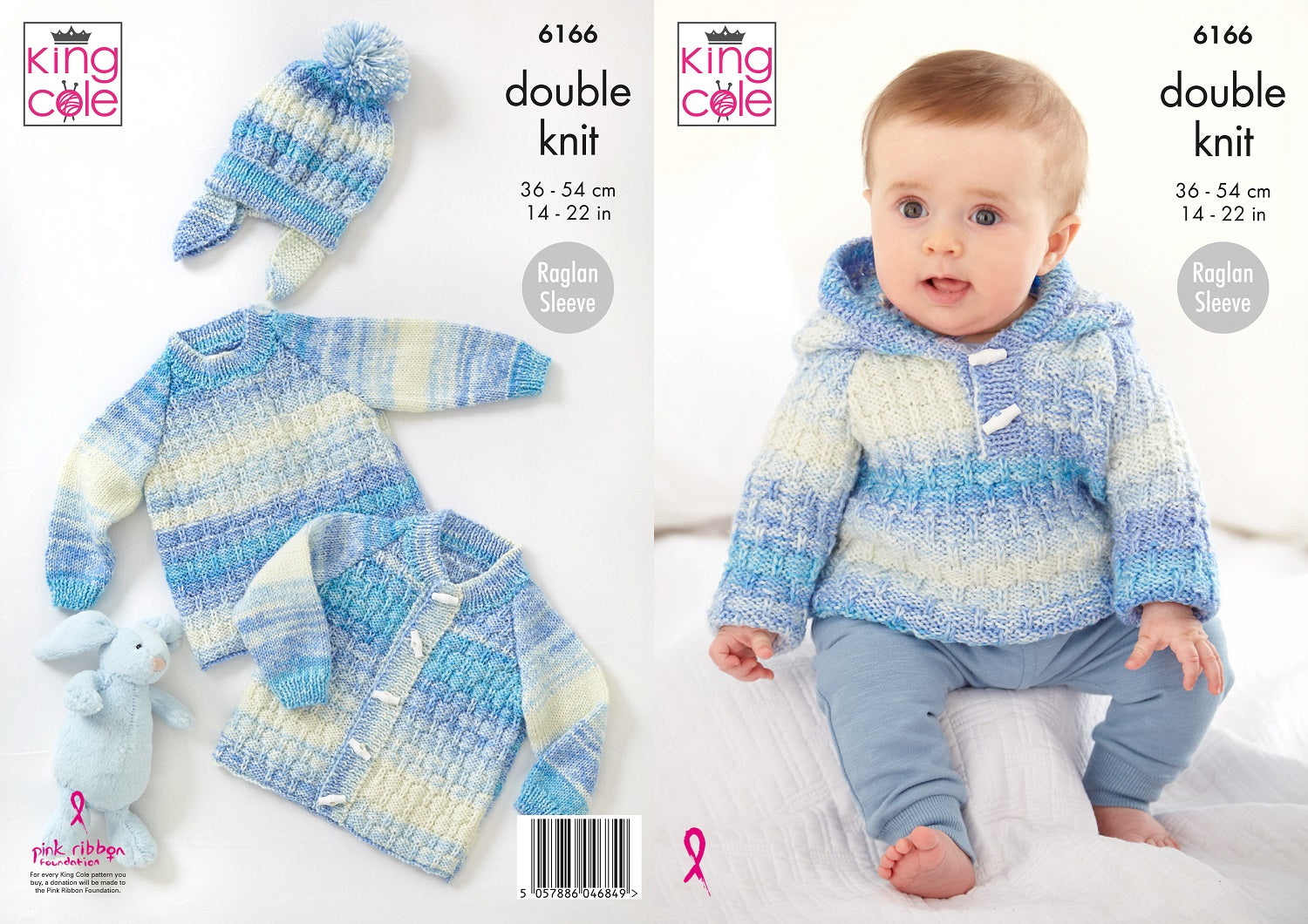 This baby knitting pattern leaflet 6166 by King Cole will instruct you on how to create a raglan sleeve sweater and jacket, and a hat.