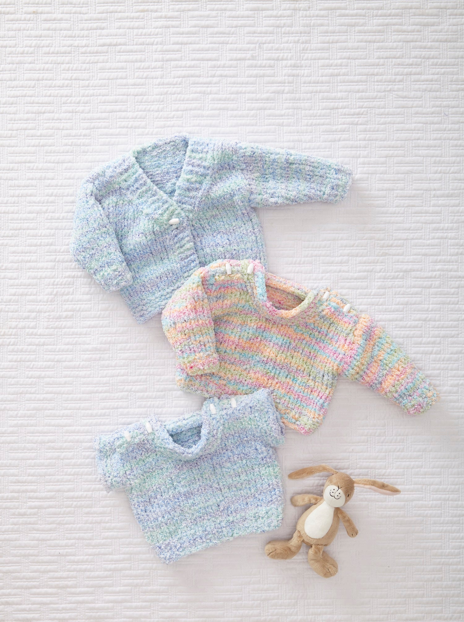 This baby knitting pattern leaflet 6237 by King Cole will instruct you on how to create a cosy sweater, slipover & cardigan.