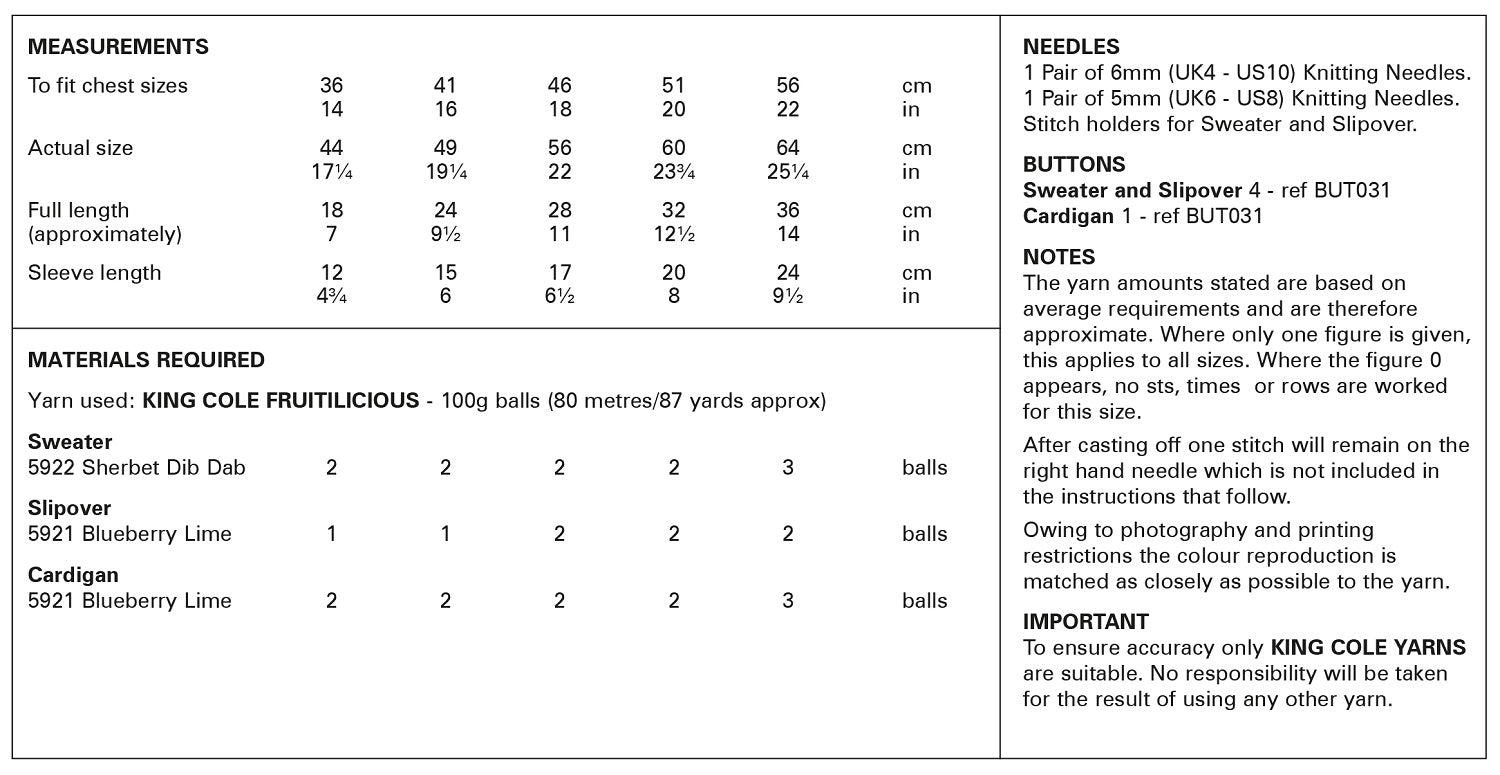 Details: This is a King Cole baby, knitting pattern that instructs you on how to knit a Sweater, Slipover & Cardigan, using King Cole Fruitilicious yarn.
