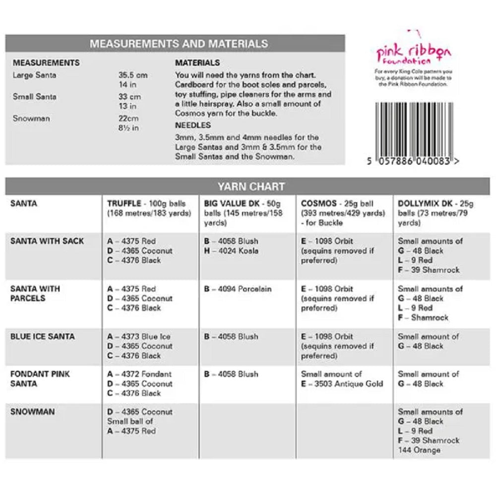 Details: This is a King Cole knitting pattern that instructs you on how to knit a large or small Santa toy, using Truffle yarn.