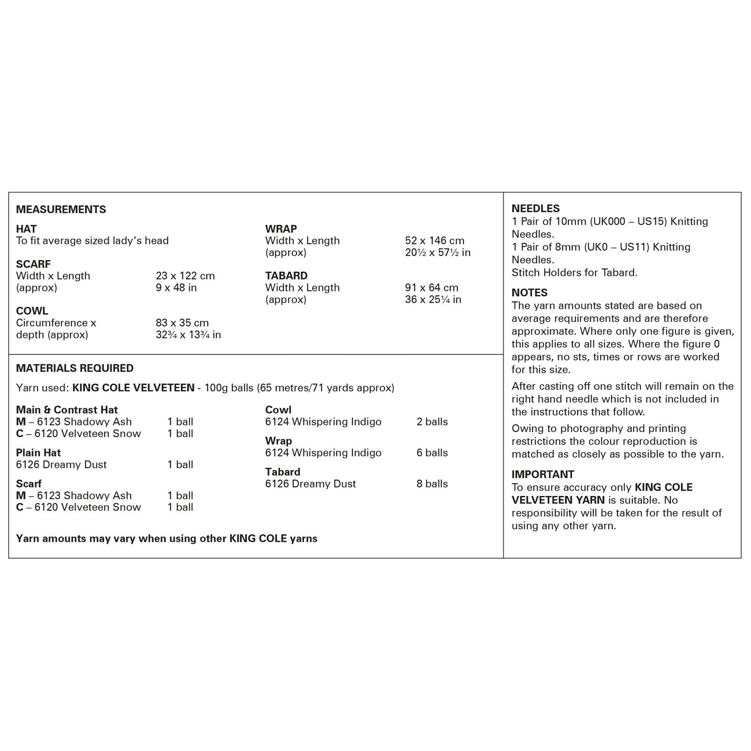• Details: This is a King Cole Velveteen knitting pattern that instructs you how to knit a ladies hat,scarf,cowl,wrap and tabard, using King Cole Velveteen yarn.